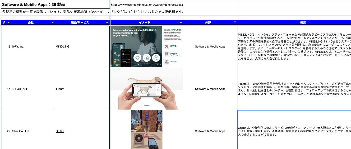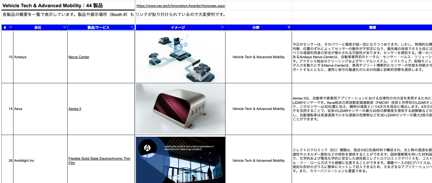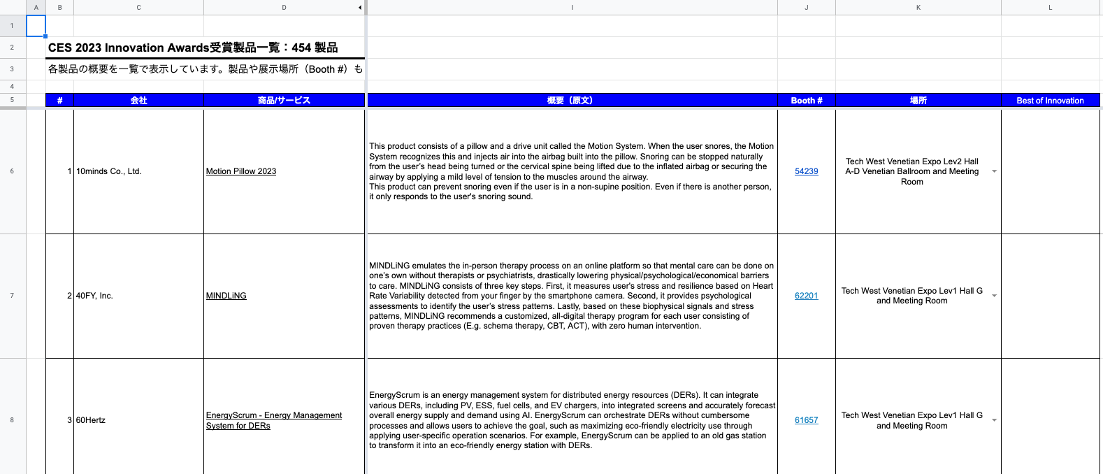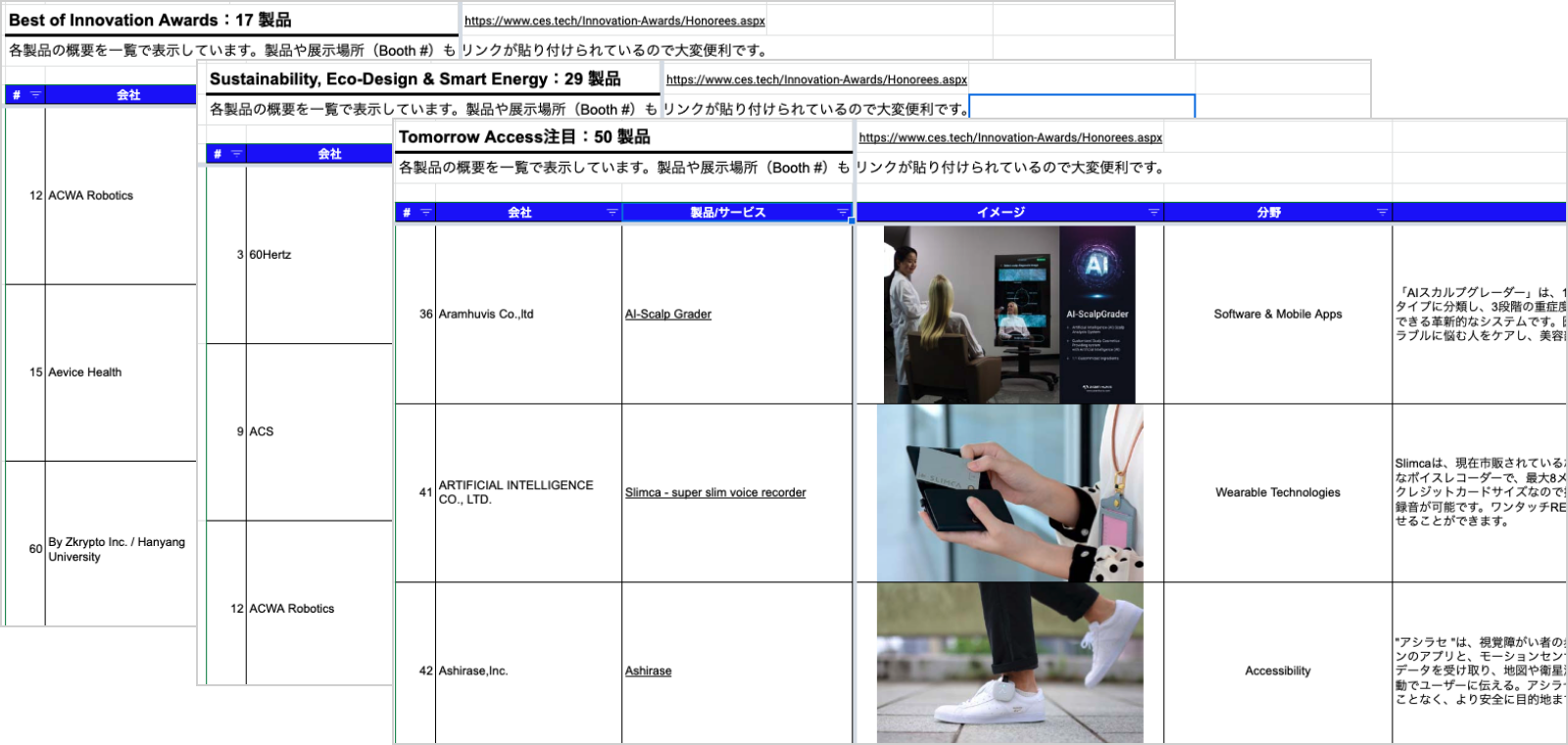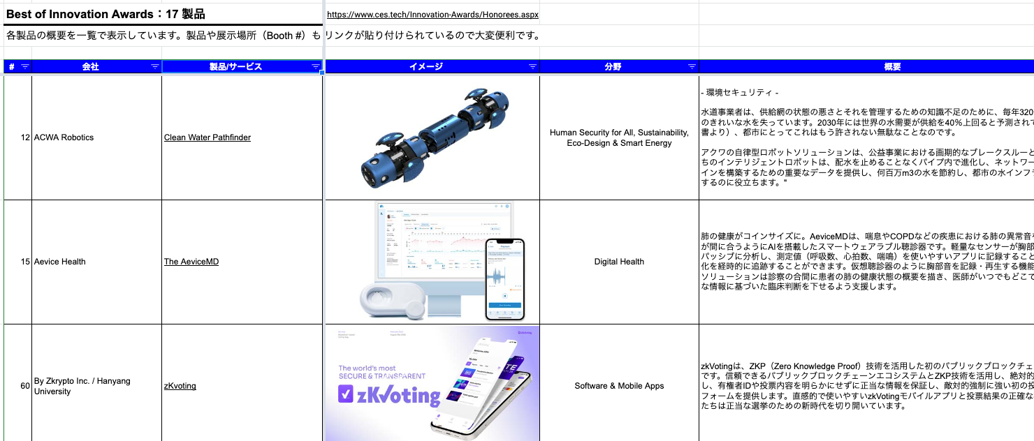 - Best of Innovationに選ばれた17製品を含む、イノベーションアワードを受賞した全454製品のリスト(一目でみてわかりやすいGoogleスプレッドシート。展示場所の地図へのリンク付き)