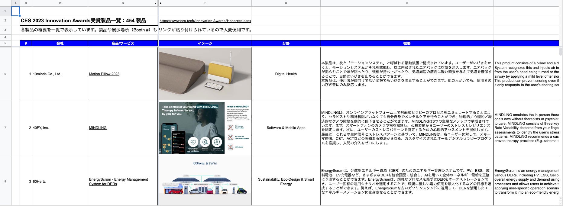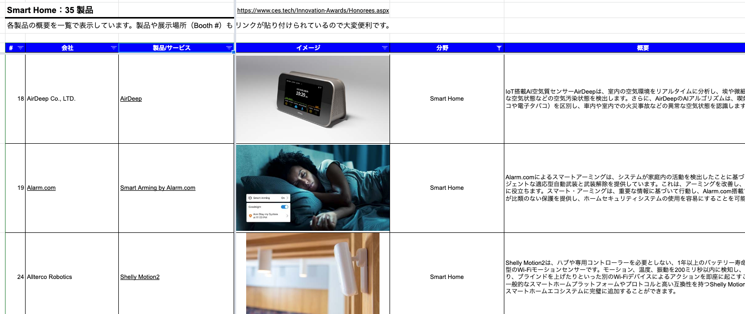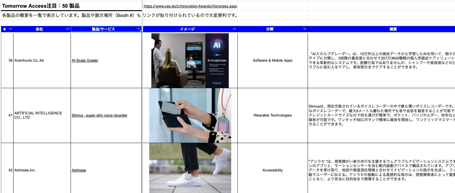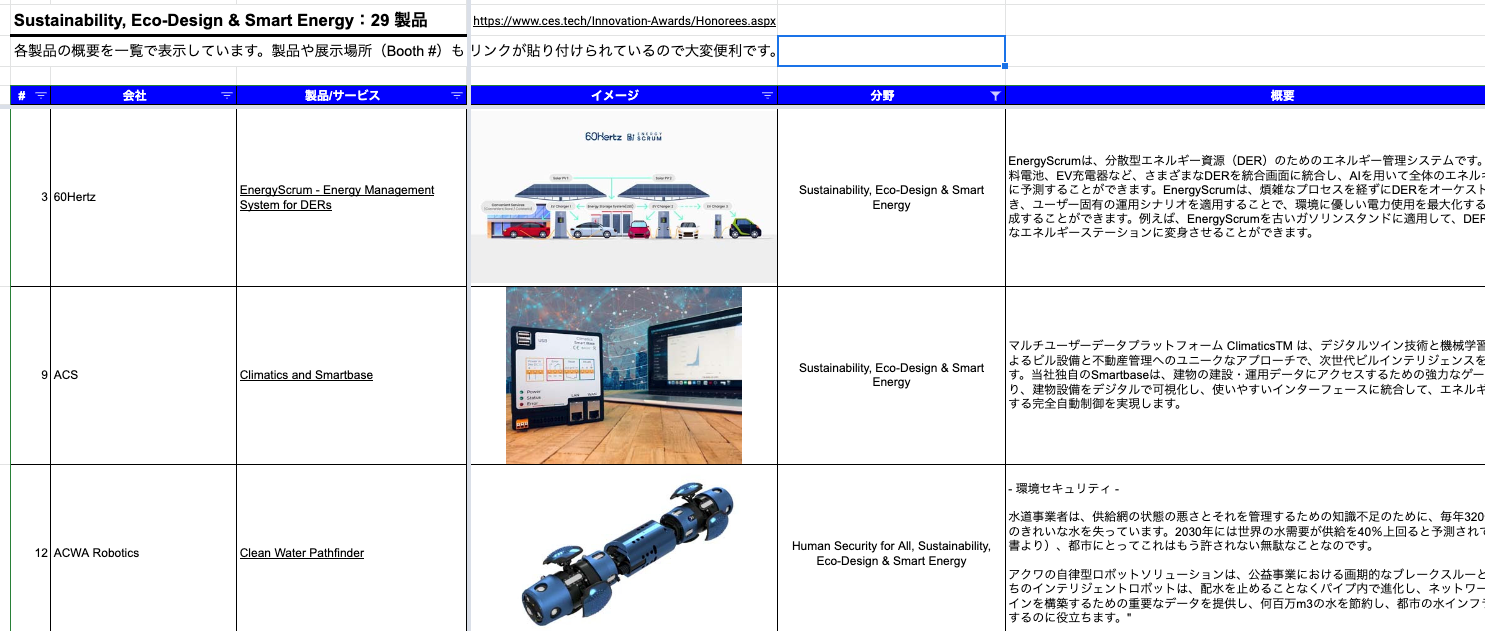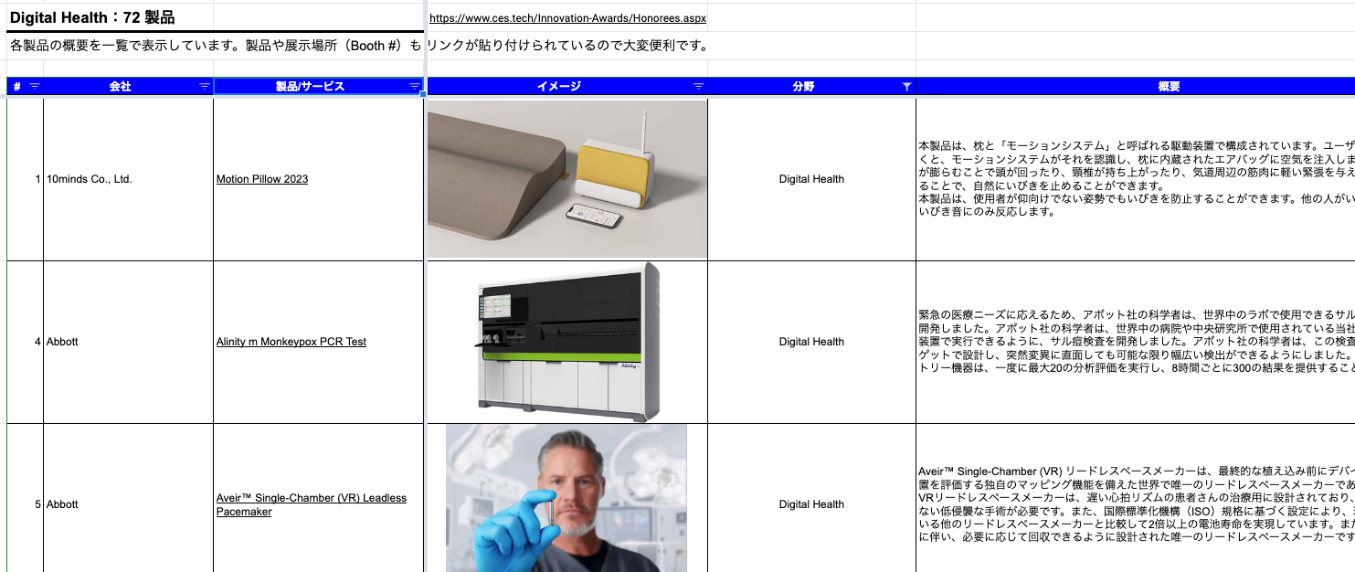 - Best of Innovationに選ばれた17製品を含む、イノベーションアワードを受賞した全454製品のリスト(一目でみてわかりやすいGoogleスプレッドシート。展示場所の地図へのリンク付き)