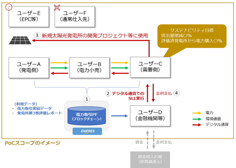 今回の実証実験では、エナリスが運用を行う電力取引プラットフォーム(ブロックチェーン)を用いた電力取引で発生する決済及びSLLの実行等をデジタル通貨DCJPYで行います。本実証実験には、比較的柔軟な目標設定が可能なSLLのサステナビリティ目標(以下:SPTs)にクリーンエネルギーの利用実績等が設定されていることを条件としたサービスが適していると考え、SPTsおよび金利テーブルを電力取引プラットフォーム(ブロックチェーン)に設定し、金融機関のSLL実行等をデジタル通貨DCJPYで行います。