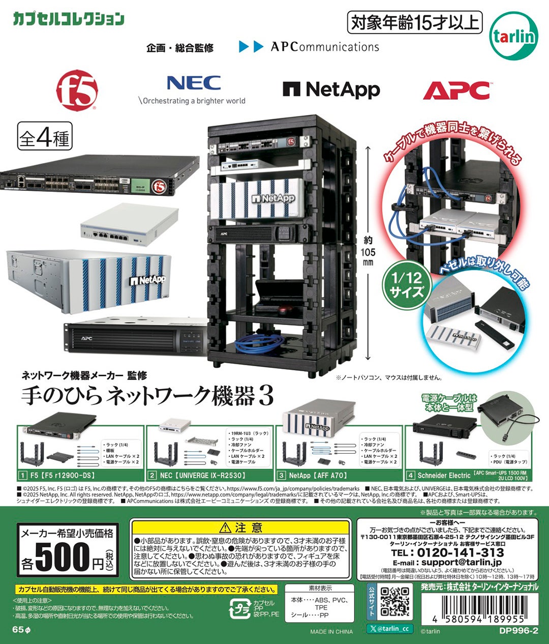 株式会社ターリン・インターナショナル(本社:東京都墨田区、代表取締役社長:佐藤直志、以下 ターリン)は、メーカー監修のもとITインフラ機器をミニチュア化した『手のひらネットワーク機器』の第3弾を、6月中旬より随時、全国のカプセルトイ自販機コーナーにて発売いたします。企画・総合監修は株式会社エーピーコミュニケーションズ(本社:東京都千代田区、代表取締役社長:内田武志、以下 エーピーコミュニケーションズ)が担当し、ネットアップ合同会社(本社:東京都中央区、代表執行役員社長:中島シハブ、以下「NetApp」)、F5ネットワークスジャパン合同会社(本社:東京都港区、カントリーマネージャー:木村 正範、以下「F5」)、シュナイダーエレクトリック株式会社(本社:東京都港区、代表取締役社長:青柳亮子、以下「シュナイダー」)、日本電気株式会社(本社:東京都港区 代表執行役社長 兼 CEO:森田 隆之、以下「NEC」)が監修しました。