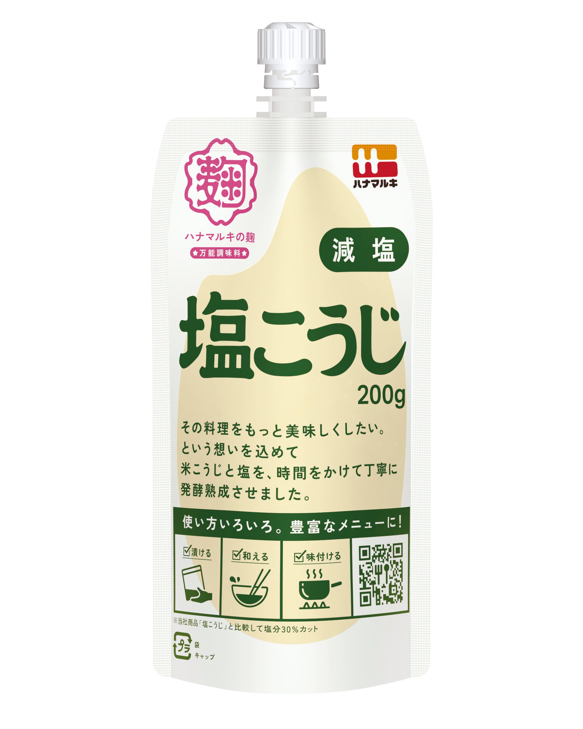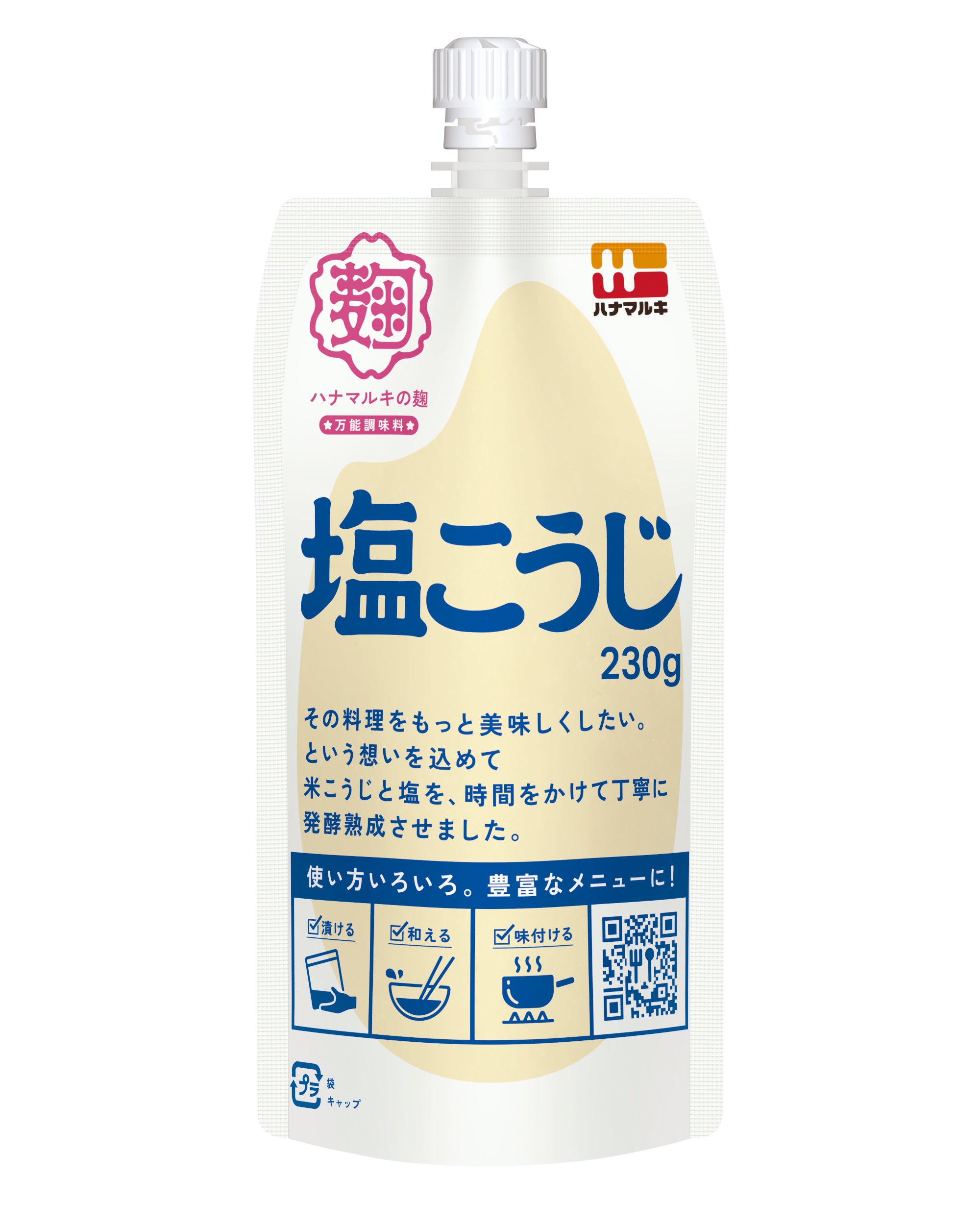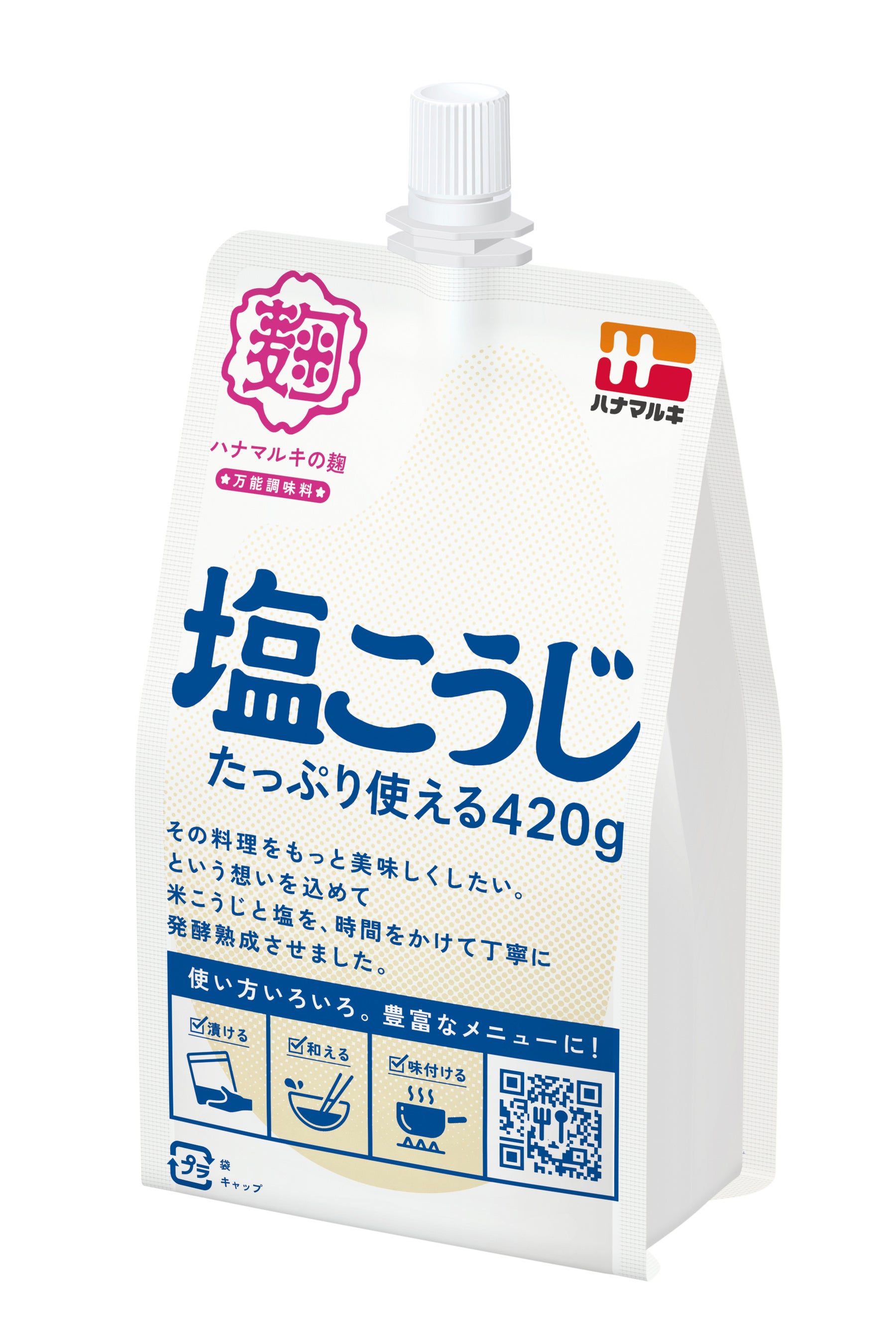 米こうじと塩を丁寧に熟成させ、こうじ由来の酵素を活きたまま袋詰めしています。活きた酵素の力と上品なこうじの旨味を持つハナマルキの塩こうじは、和食にも洋食にも良く合い、便利で使いやすい万能調味料です。