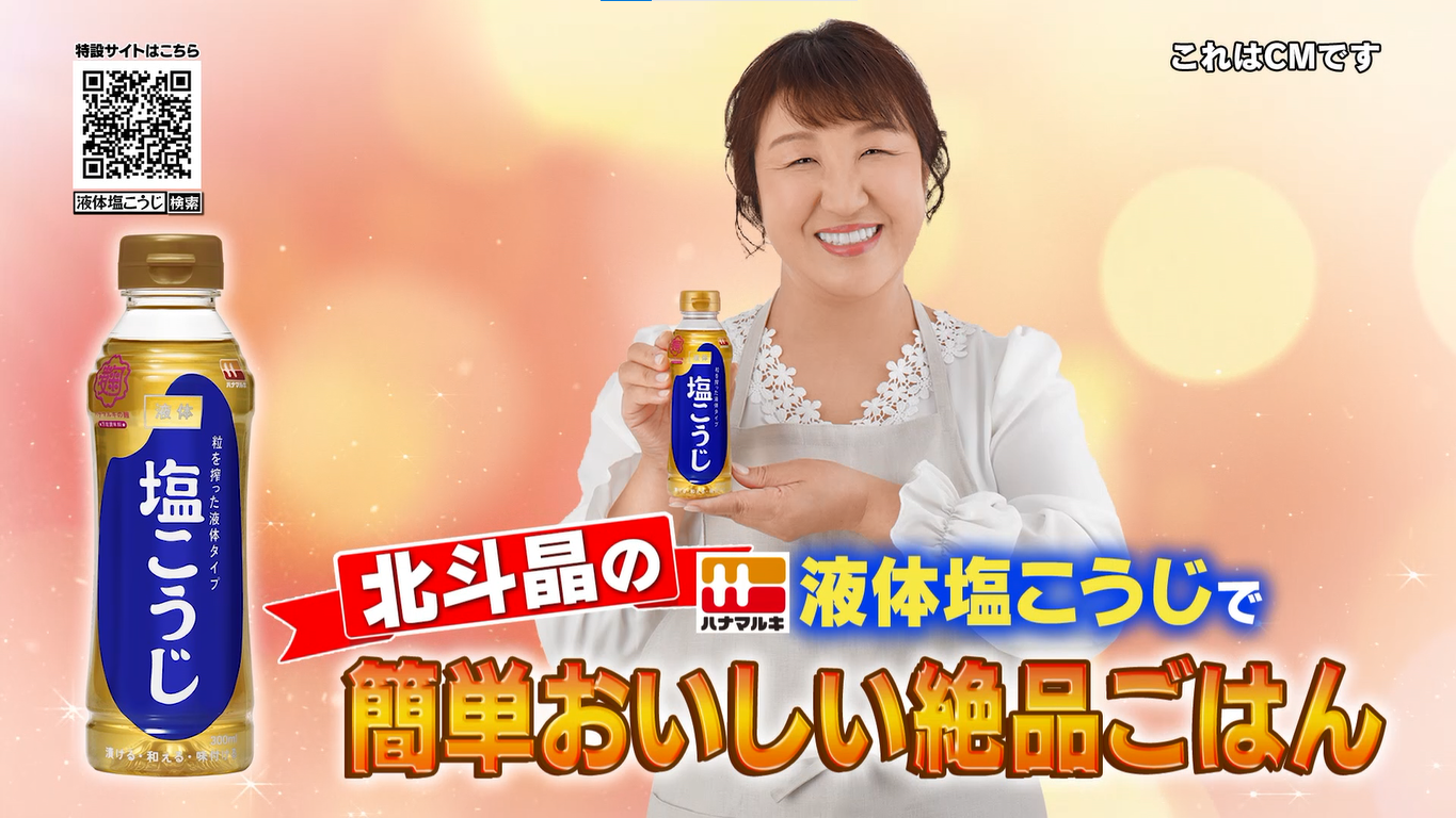味噌・醸造製品メーカーのハナマルキ株式会社(本社:長野県伊那市、代表取締役社長:花岡周一郎、以下、当社)は、3月よりパッケージデザインの全面リニューアルを実施した万能調味料「液体塩こうじ」の新90秒TVCMを、4月1日(土)より全国で順次放映開始します。新CMには、液体塩こうじ公式アンバサダーに就任したタレント・北斗晶さんを起用し、ご本人監修レシピを料理番組風にご紹介いただきます。