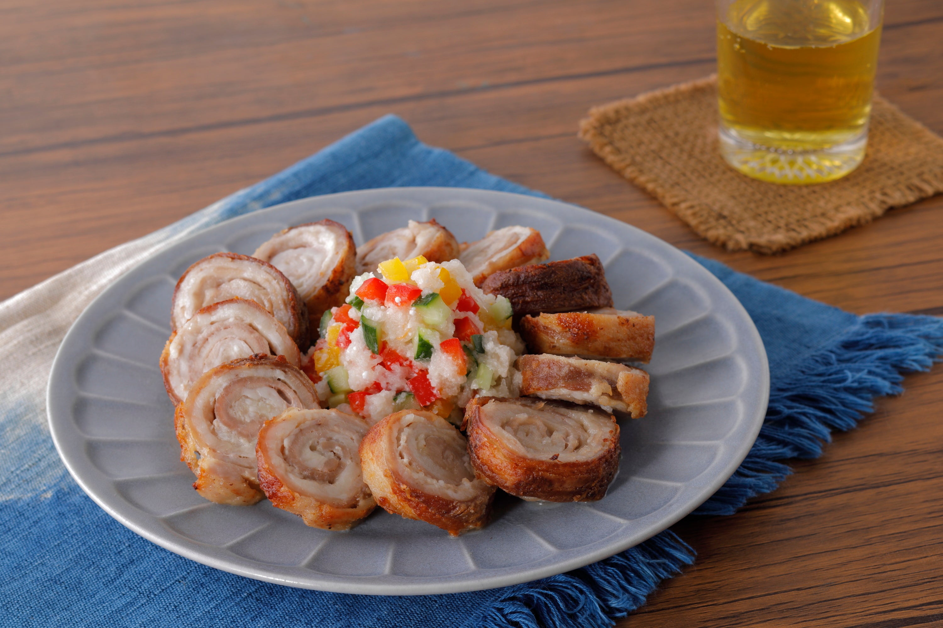 ・「ぐるぐるチャーシューのカラフル塩こうじみぞれソース」