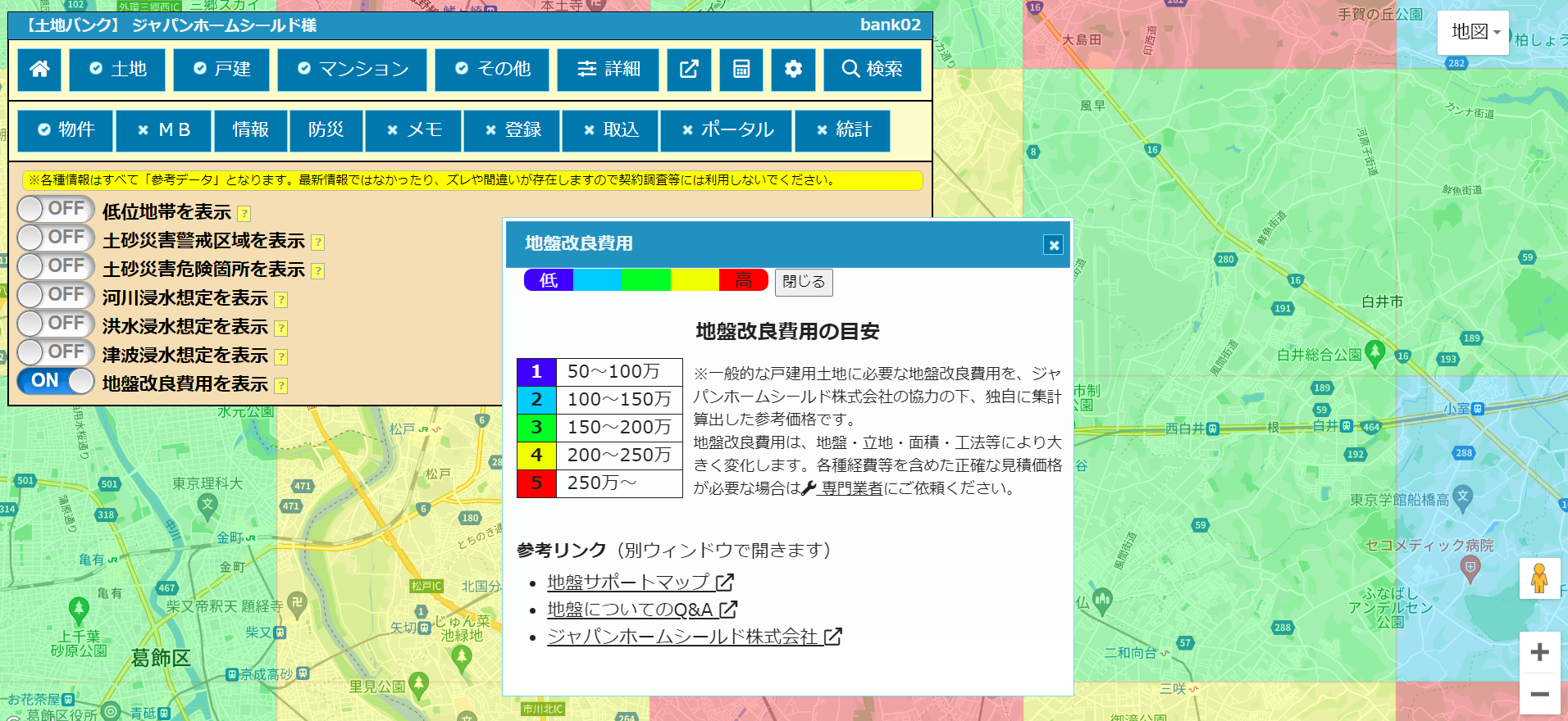 今回、ネットデータ社が提供する土地BANKとのシステム連携が実現し、JHSの地盤調査実績に基づく地盤対策費の情報が土地BANKに反映されることになりました。これにより、土地を探す際に土地の価格とあわせて地盤対策費用も考慮できるようになり、購入者は住宅購入の際の資金計画が組みやすくなります。購入者の土地探しを支援する住宅会社にとっても購入後の予算変更のリスクが小さくなり、安心して土地の提案を行うことができます。