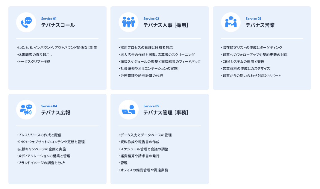 例えば、テバナスは休眠顧客の掘り起こし架電業務やアウトバウンドセールス、事務業務等、痒い所に手が届く、圧倒的コミット型のリソース転換サービスです。