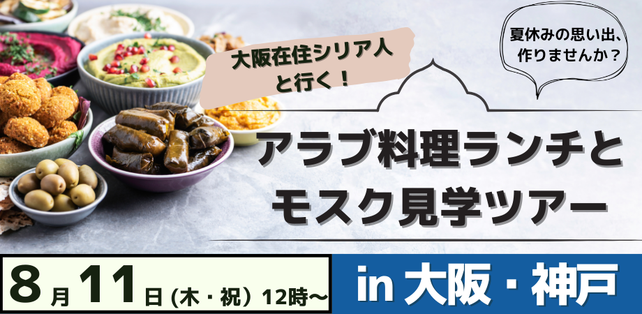 大阪・神戸でアラブを体験!「シリア人と行く!アラブ料理ランチとモスク見学ツアー」を8/11に開催