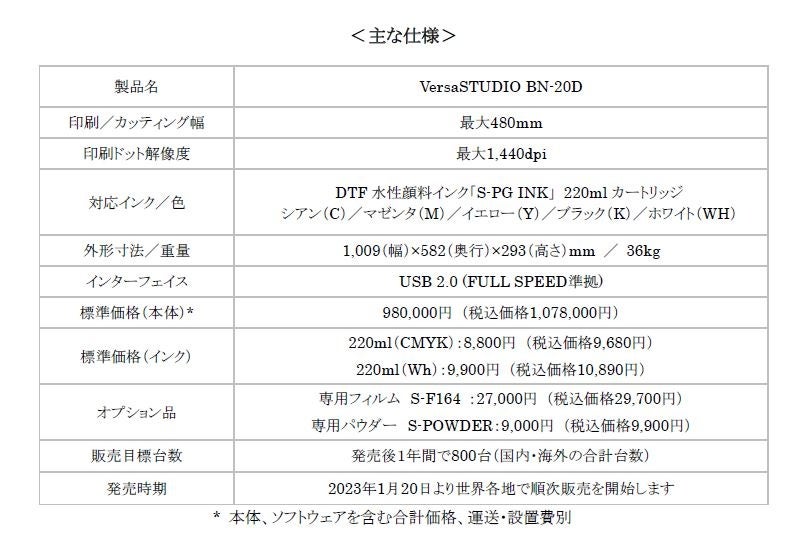 コンパクトで、使いやすく、導入しやすいデスクトップタイプのDTF転写対応プリンター登場。VersaSTUDIO「BN-20D」世界同時発表