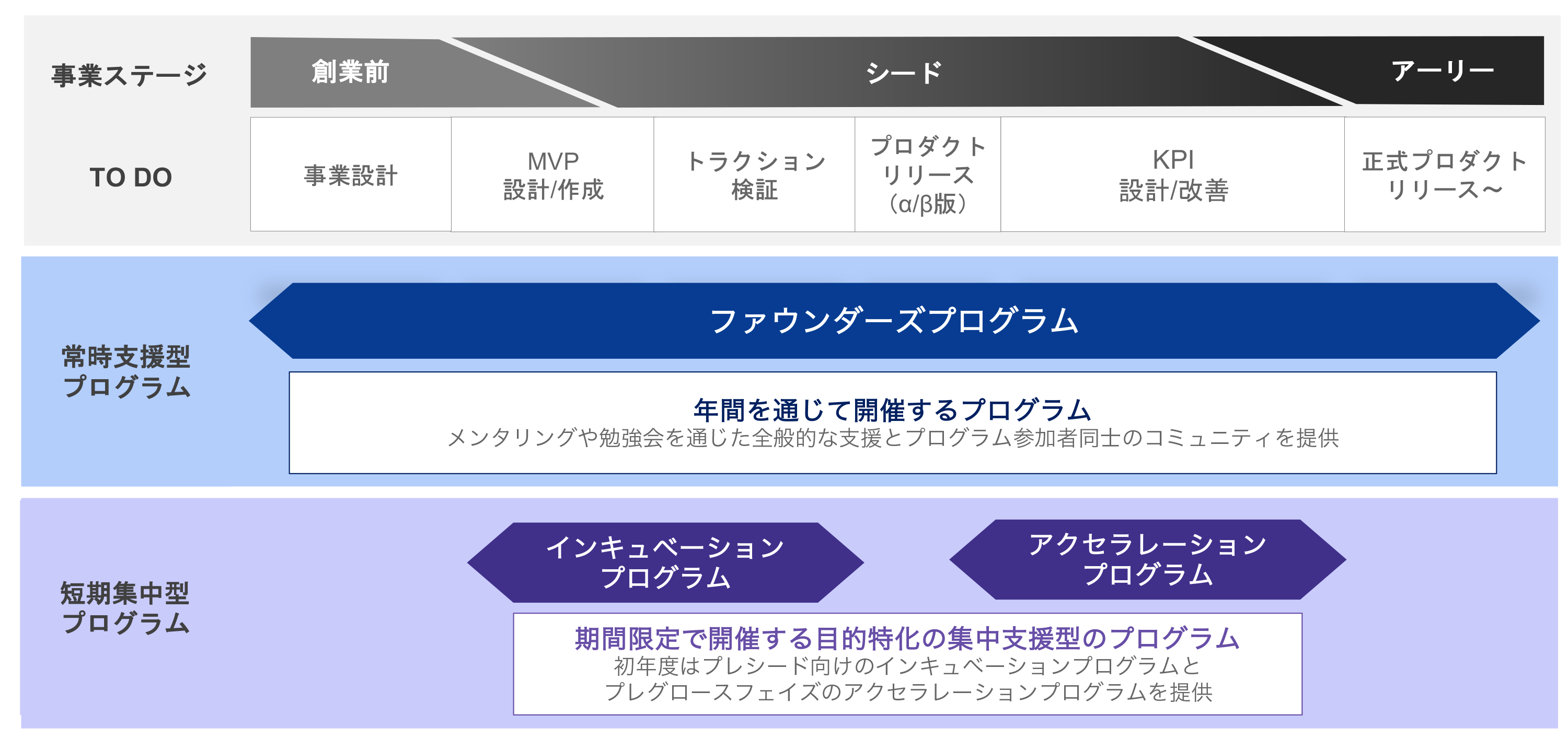 「PRE-STATION Ai」で展開する短期集中型プログラムは、創業直後からシードステージまでのスタートアップを対象としており、4カ月間で資金調達が可能な状態を目指して事業成長を集中的に支援するプログラムです。スタートアップの成長ステージに合わせて、「インキュベーションプログラム」と「アクセラレーションプログラム」を展開し、定期メンタリングや勉強会などを実施します。また、プログラム終了時には成果発表の場としてDemo Day(デモデイ)を開催します。