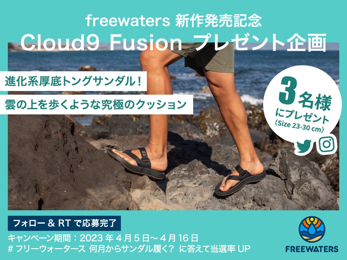 カリフォルニア発のサステナブルフットウェアブランド『FREEWATERS (フリーウォータース)』は、USセレブも愛用する毎年大人気の定番商品Cloud9 Fusionを今季もリリース致しました。夏を待てないユーザーから早くもご好評頂く中、さらにその魅力を広めるためにプレゼントキャンペーンを実施します。(キャンペーンURL Twitter:https://twitter.com/Freewaters_jp/status/1643406190041513985 / Instagram:https://www.instagram.com/p/Cqok247v0l4/?hl=ja)