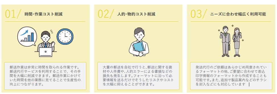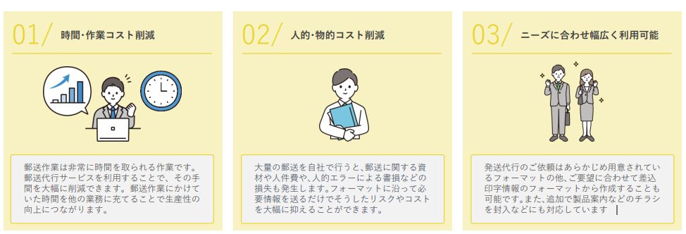 大量の郵送を自社で行うと、郵送に関する資材や人件費や、人的エラーによる書損などの損失も発生します。フォーマットに沿って必要な情報を送るだけで、そうしたリスクやコストを大幅に抑えることができます。