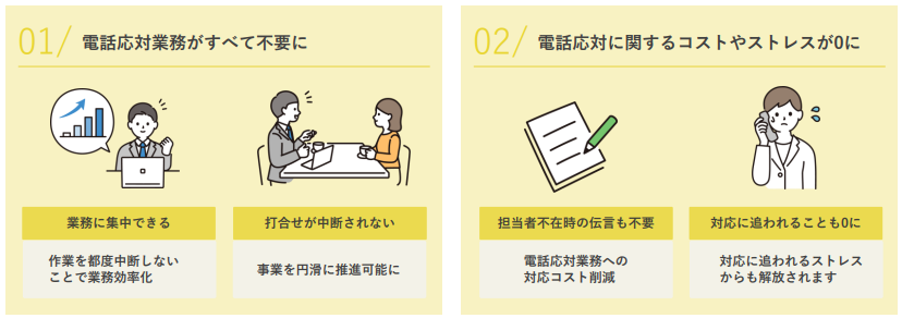 入電タイミングは基本的に突発的なため、入電時に担当者が不在だった場合の伝言や連絡、時間帯によっては電話番の為に席を立てないなど、電話応対業務の対応コストは小さくありません。入電の一次対応がなくなるだけでこうしたストレスが0になります。