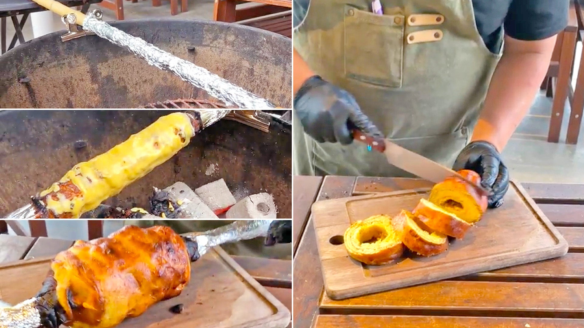 ・BBQグリルに竹筒を載せ、「焼き担当」がつるくる回しながら炭火の熱で焼く