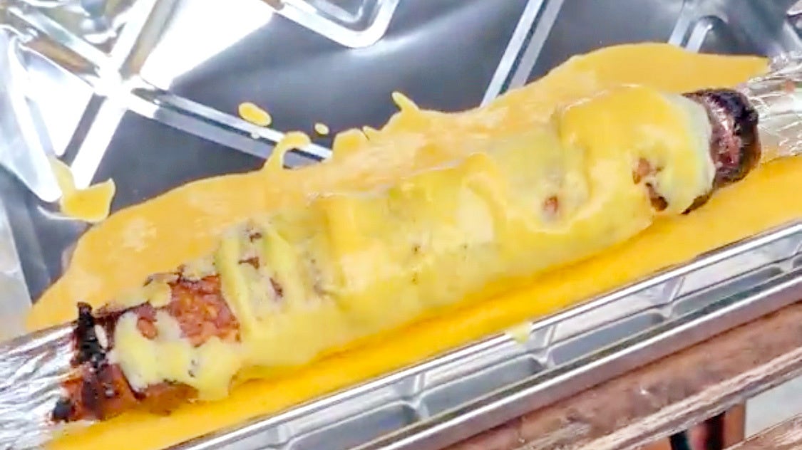 ・竹筒からゆっくりと抜き、両端をカットすればバームクーヘンの出来上がり