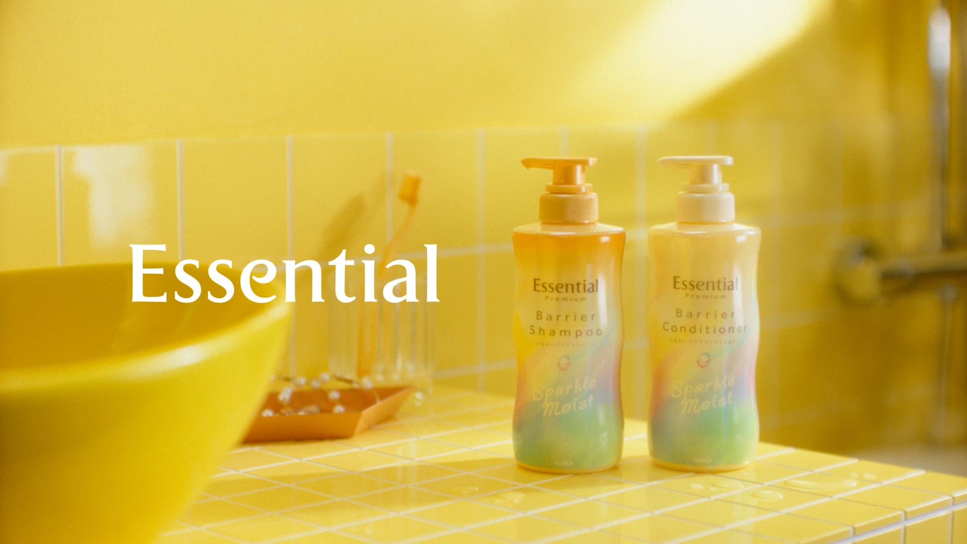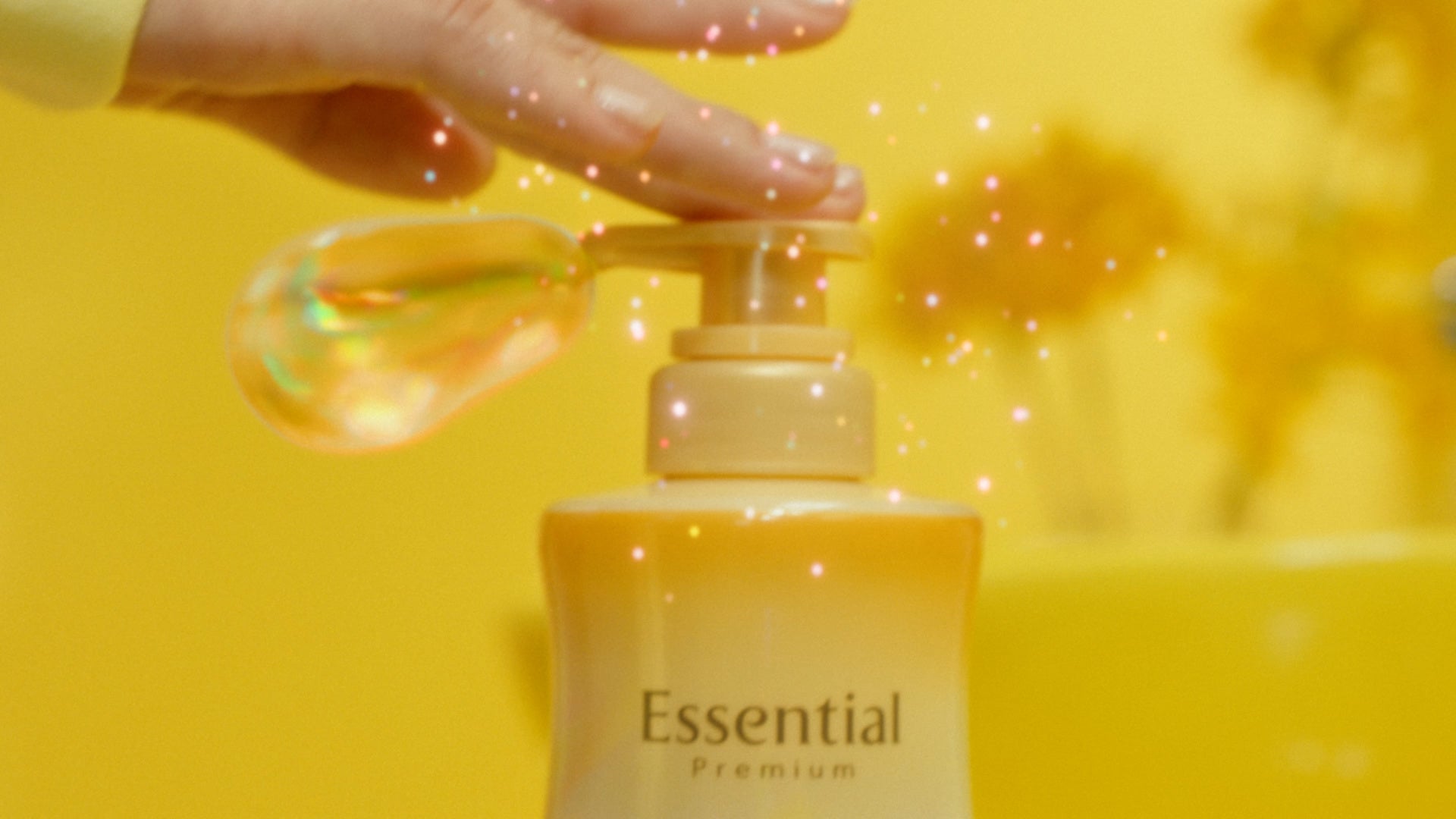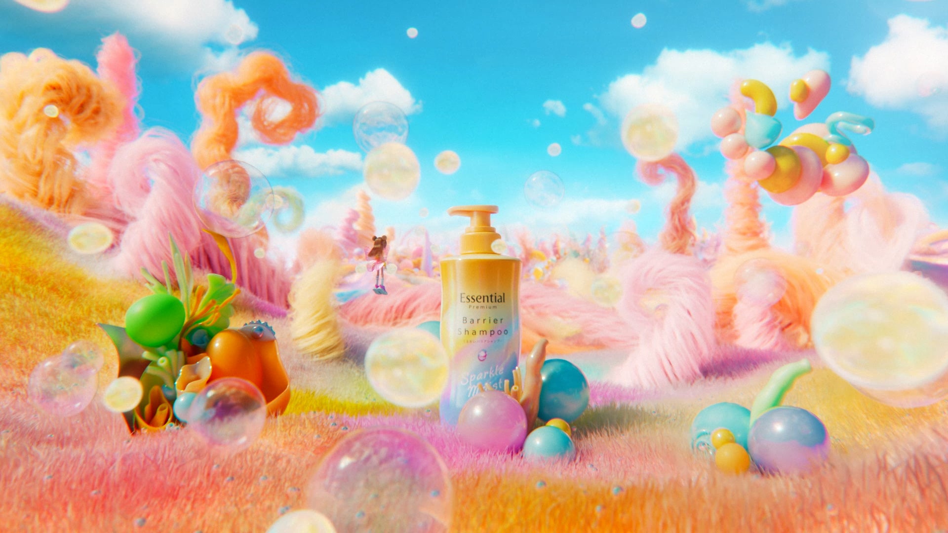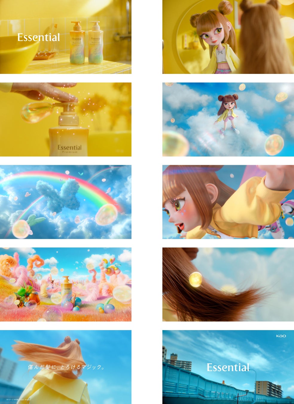 新CMでは、傷んだ髪に悩む一人の女の子が主人公。ある日、鏡の中のもうひとりの自分に促され、シャンプーに触れた瞬間にCGの世界に導かれます。そこはまるで“Essential”がつくり出すHAPPYな異世界。幻想的でポップな空間には不思議なとろとろの黄色い玉が漂っており、その玉が髪に触れるとダメージ髪もトゥルンとまとまっていきます。美しい髪をなびかせながら彼女は、笑顔と自信を携えて、再び現実の世界へと駆け出していきます。そんな前向きなストーリーを、CGならではの表現とカラフルなビジュアルで描き、見た人の心も軽くなるようなポジティブな変化を感じさせるCMに仕上げました。