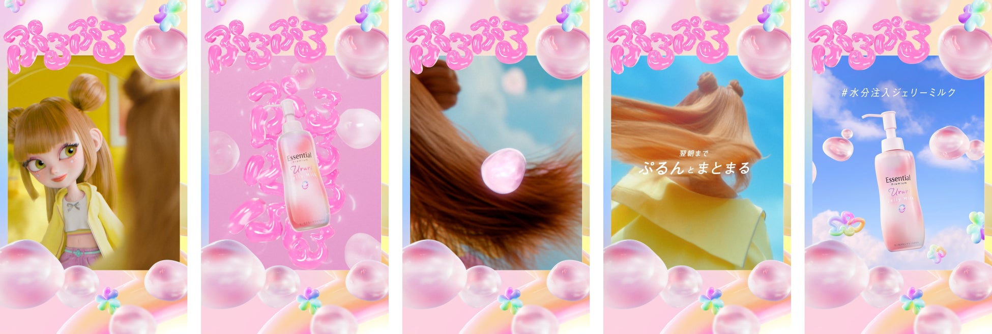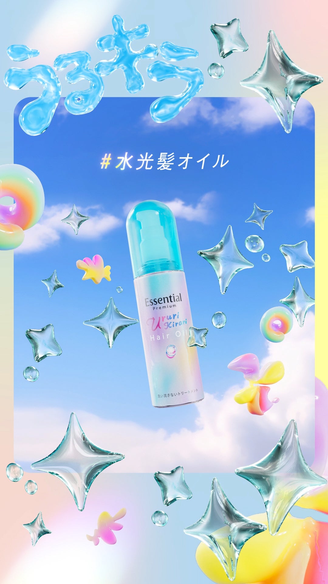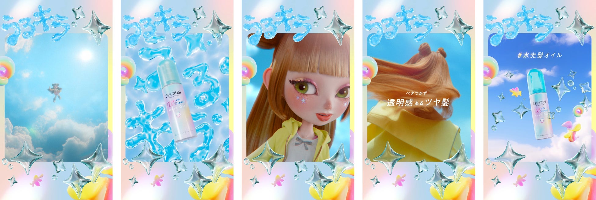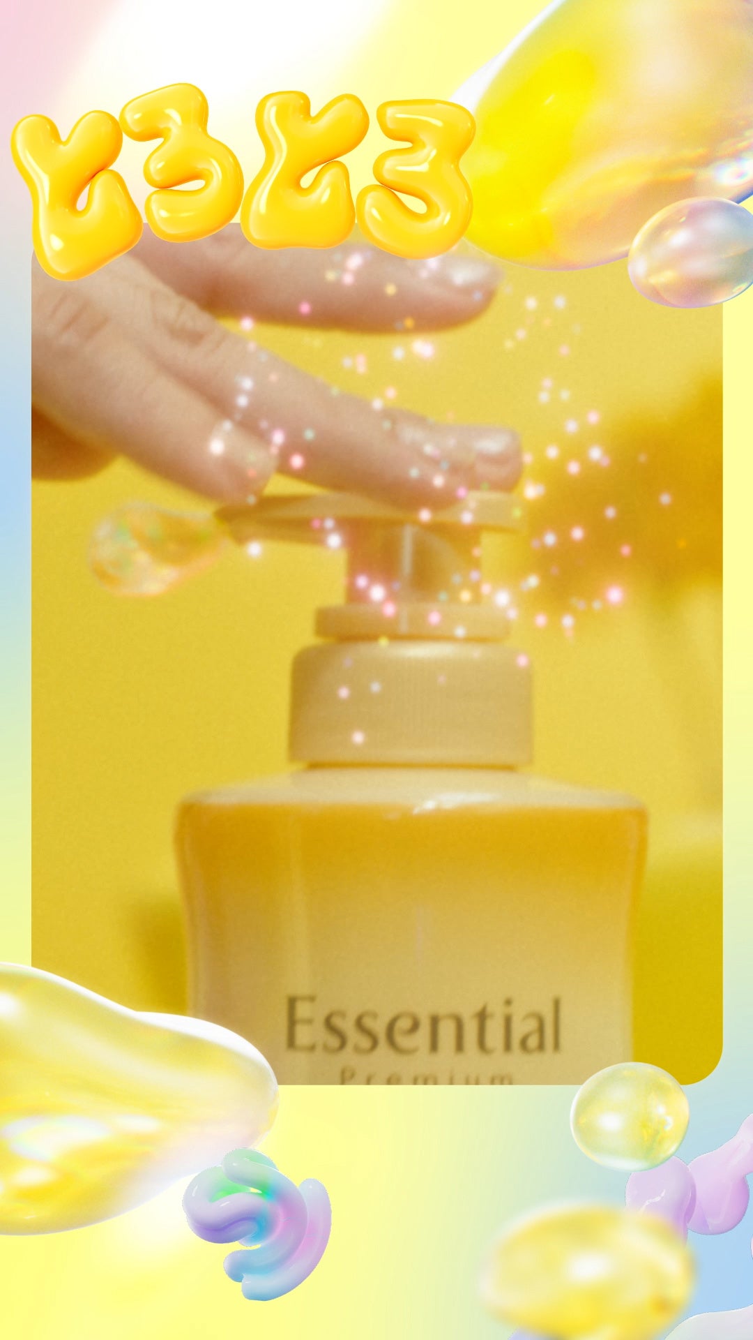 新CMでは、傷んだ髪に悩む一人の女の子が主人公。ある日、鏡の中のもうひとりの自分に促され、シャンプーに触れた瞬間にCGの世界に導かれます。そこはまるで“Essential”がつくり出すHAPPYな異世界。幻想的でポップな空間には不思議なとろとろの黄色い玉が漂っており、その玉が髪に触れるとダメージ髪もトゥルンとまとまっていきます。美しい髪をなびかせながら彼女は、笑顔と自信を携えて、再び現実の世界へと駆け出していきます。そんな前向きなストーリーを、CGならではの表現とカラフルなビジュアルで描き、見た人の心も軽くなるようなポジティブな変化を感じさせるCMに仕上げました。