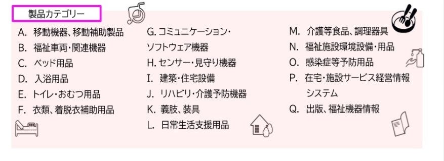 ”福祉機器”という展示会名称がついておりますが、出展対象とする製品・カテゴリーについては、いわゆる介護保険適用の福祉用具(車いすや介護ベッド)のみならず、高齢者向けコミュニケーション機器、防災備品、介護食、自助具等、高齢者・障害者(児)の自立促進と社会参加に係るさまざまな製品の展示が可能です!