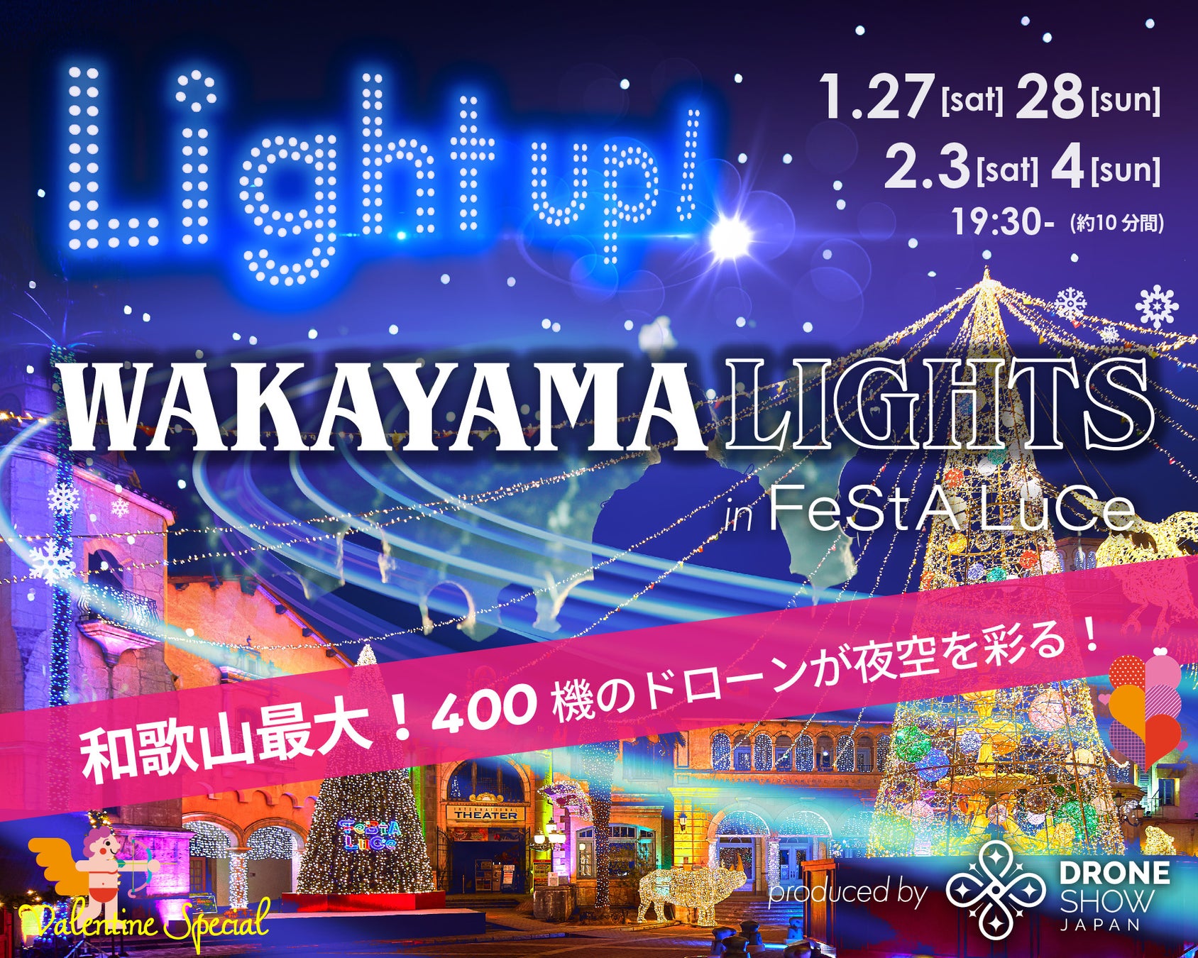 フェスタ・ルーチェ実行委員会(会長:古澤良祐)と国内ドローンショー実績No1※の株式会社ドローンショー・ジャパン(本社:石川県金沢市、代表取締役:山本雄貴)は、「フェスタ・ルーチェ〜本当のクリスマスに出逢える場所〜」において、2024年1月27日(土)28日(日)、2月3日(土)4日(日)に和歌山最大400機のドローンショー「WAKAYAMA LIGHTS in FeStA LuCe produced by Drone Show Japan」を開催いたします。
