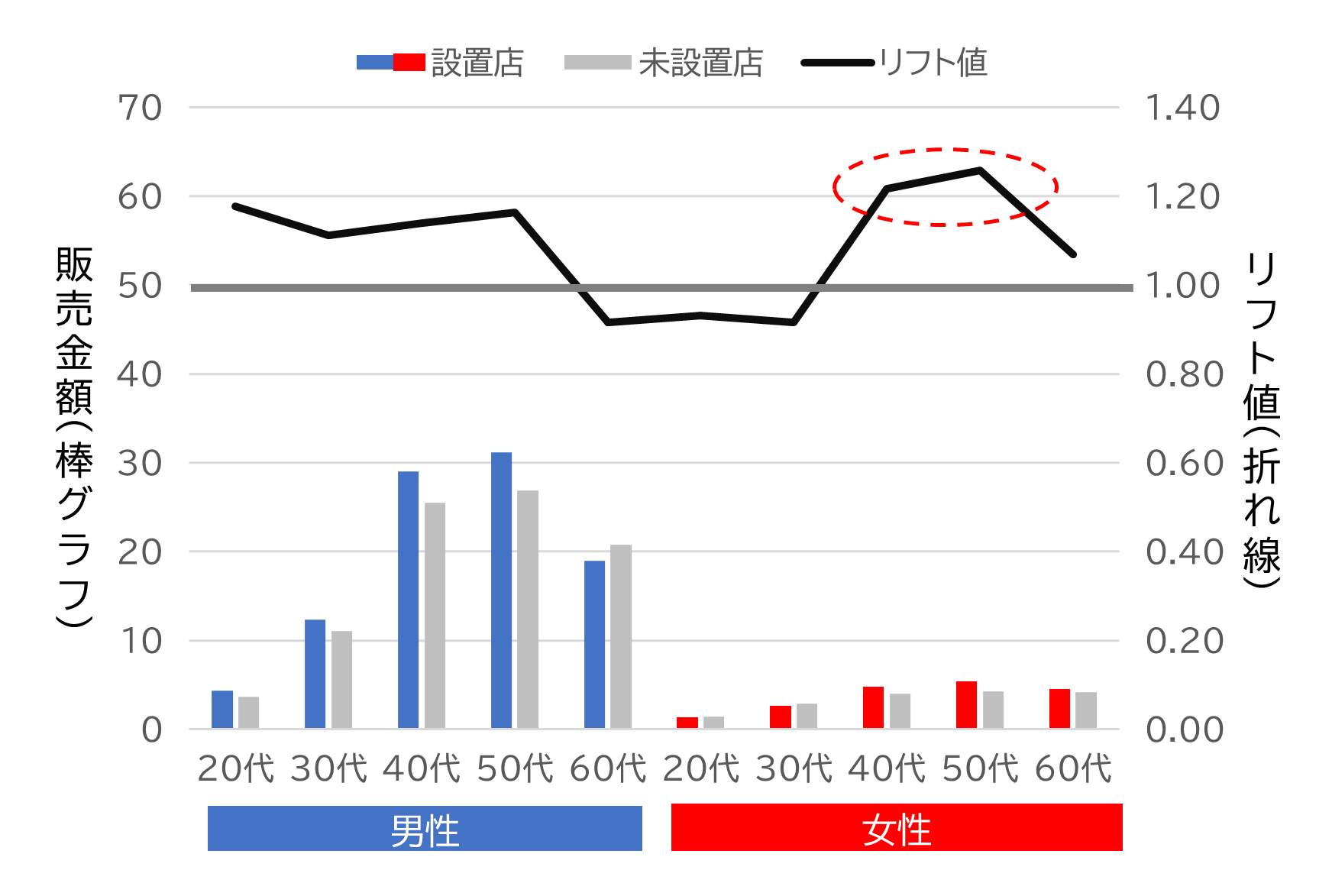 その結果、40代の男女に留まらず、ターゲット以外の50代男女でもPOSリフトがみられました。