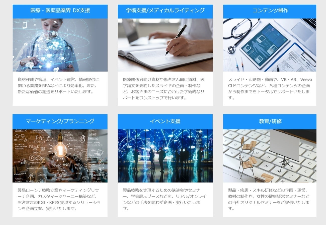 また、医療・医薬品の世界で培ったノウハウを活かし、コンテンツ作成や管理、イベント運営、情報提供に関わる業務の自動化・効率化にも取り組んでおります。