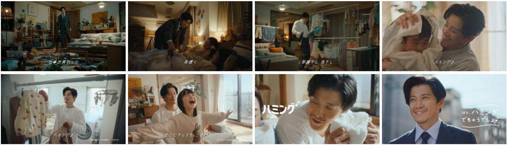 新TVCMでは、良い香りのする洗たくもので家族が笑顔になるのが嬉しい、洗たく好きのパパを小栗旬さんが演じます。仕事から夜遅く帰宅後に家族のためにノリノリで夜干しをする様や、朝出勤前に乾いた洗たく物を畳む様子、休日に家族と洗たくものを片付ける様子など、洗たくを通して、家族を優しく見守るパパの姿を描いた内容となっています。家族の笑顔を見て、「この世で一番大切なのは、あなたのハミング」と一言。ゴキゲンな暮らしをお手伝いする、「ハミング消臭実感」の魅力を発信しています。