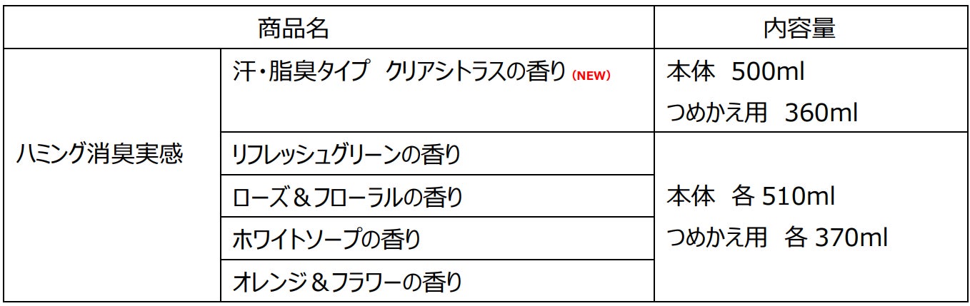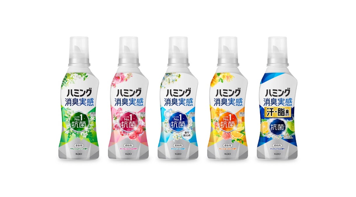また、この発売に合わせてハミング内No.1※1抗菌※2のレギュラータイプ「リフレッシュグリーンの香り」「ローズ&フローラルの香り」「ホワイトソープの香り」「オレンジ&フラワーの香り」のパッケージもリニューアル。「汗・脂臭タイプ」と合わせて選べる5タイプの品揃えです。