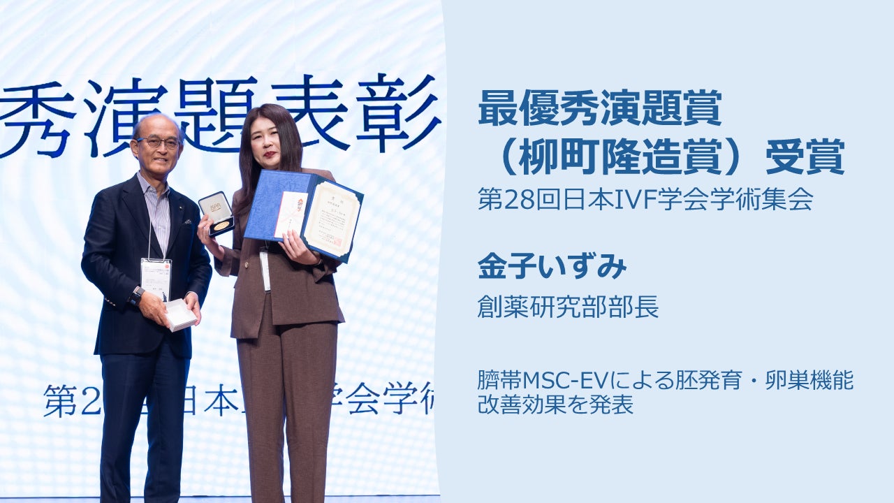 2025年10月、株式会社EXORPHIA(本社:東京都、代表取締役CEO:口石幸治)は、第28回日本IVF学会学術集会(JSAR Annual Meeting 2025)において、当社創薬研究部 部長・金子いずみの発表が「最優秀演題賞(柳町隆造賞)」を受賞したことをお知らせいたします。本賞は、生殖補助医療(ART)の進歩に寄与する優れた研究を行った会員に授与されるものです。