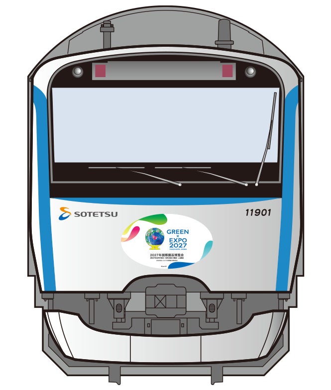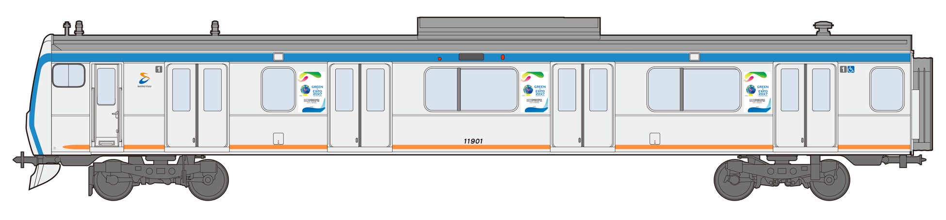 側面には「GREEN×EXPO 2027」ビジュアルを、最端部車両の前面には、「GREEN×EXPO 2027」特別ヘッドマークをラッピングしています