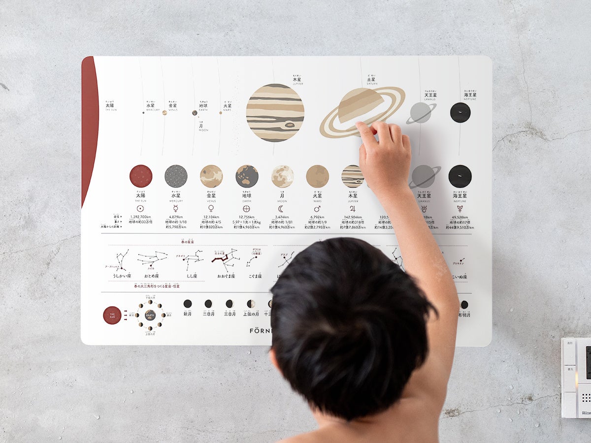 同ブランド43番目の商品となる「惑星ポスター」。インテリア雑貨・ギフトの通販サイト、アンジェのベビーキッズブランド「クッカヤプー」とのコラボアイテムとして誕生しました。フォルネの知育ポスターシリーズの中で、10種類目となる商品です。