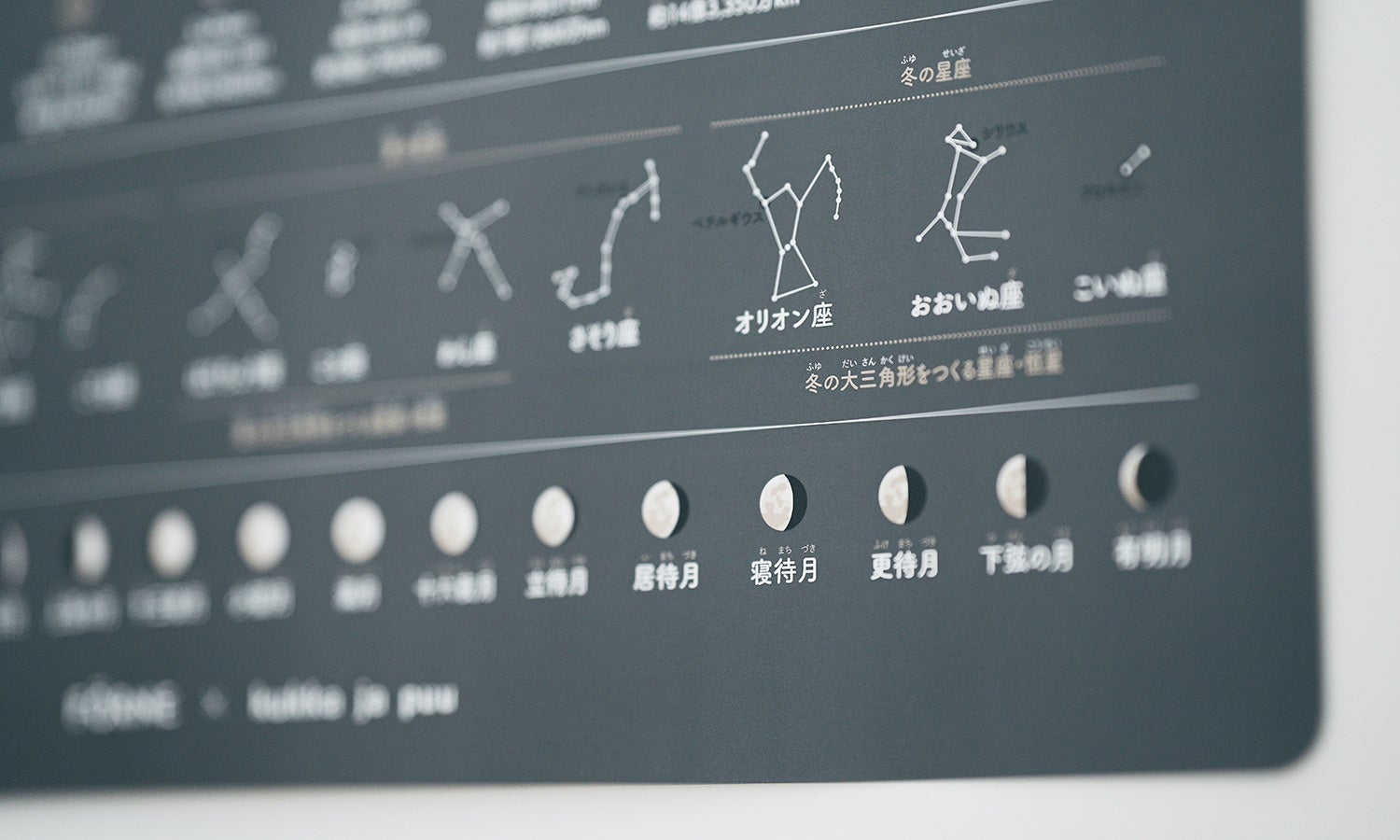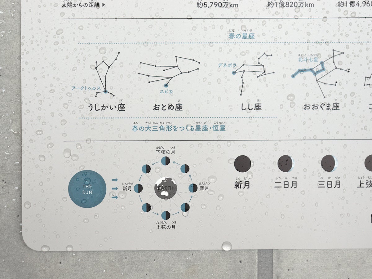 ポスター下部には春・夏・冬の空で実際に見られる大三角形と、それを構成する星座を紹介。新月、満月、有明月など満ち欠けする月のイラストと呼び名も掲載しているので、親子で一緒に夜空を眺めながら星や月を探すのもおすすめ。