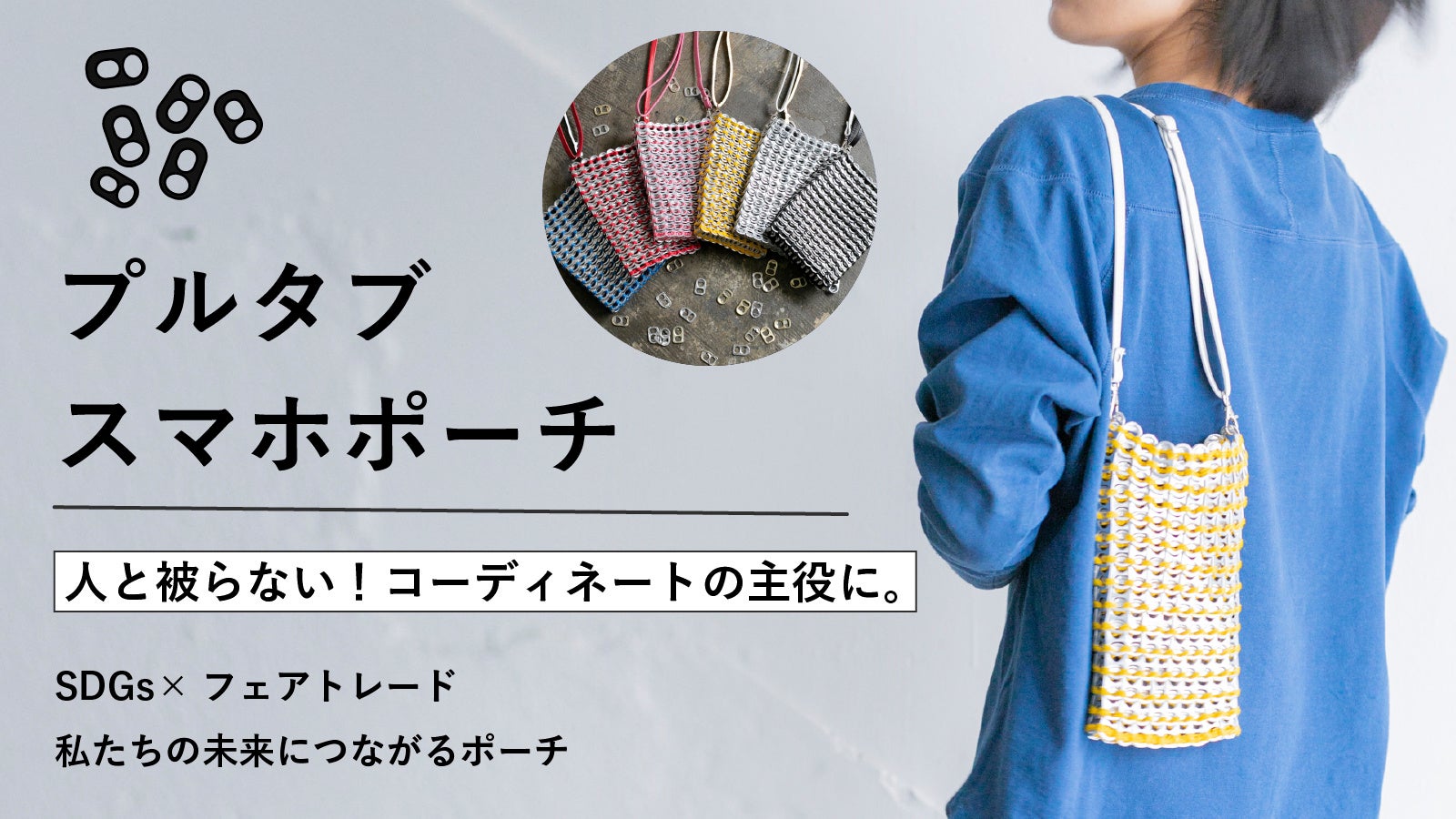 文字通り「プルタブ」を編み込んで作る商品を展開するブランド。プルタブはシンプルかつ予想を裏切る軽さが特徴です。さらに錆びづらく、変色もしないので長く使っていただくことができます。エシカルアイテムの象徴的なプロダクトは、バックやポーチ、アクセサリーなど多岐にわたっています。