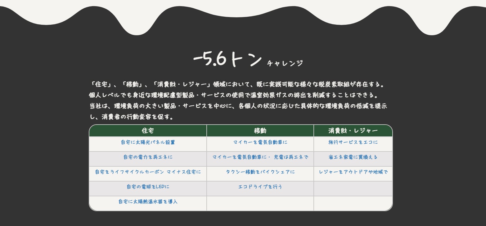 本プラットフォームでは、企業様の脱炭素ライフスタイルに関連する製品やサービスの紹介や需要促進を企画しています。当社は、家庭の主要排出源である住宅、移動、消費財・レジャーの領域に特化したプラットフォームを構築し、低炭素ライフサイクルの実現に大きく貢献したいと考えます。