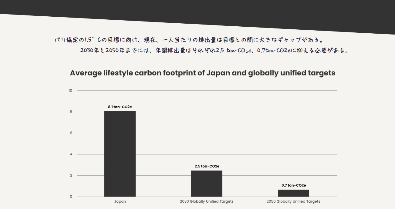 環境や持続可能性に関する研究・啓発活動を行っている国際組織Hot or Cool Instituteによれば、パリ協定の1.5°Cの目標に向けて、2030年までには世界全体で1人あたりの年間排出量を2.5トンCO2eに抑える必要があります。しかし、現在の日本人の平均排出量は年間8.1トンCO2eであり、年間5.6トンの排出削減が必要です。