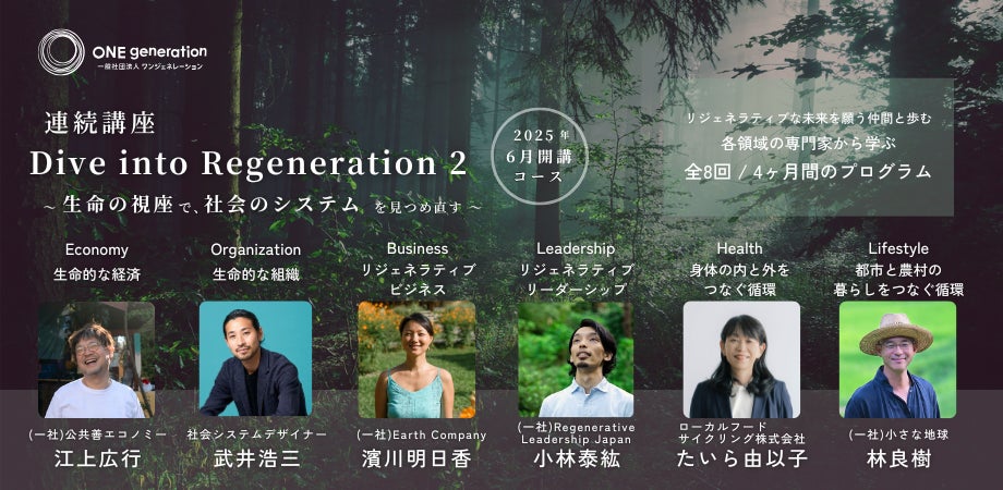 「Regeneration of Lifeあらゆる生命のつながりを再生する」をビジョンに掲げ、気候危機を私たちの世代で終わらせるための変容を喚起する一般社団法人ワンジェネレーション(所在地・東京都中央区、代表理事・鮎川詢裕子、以下ワンジェネレーション)は、リジェネラティブな未来を願う仲間と歩む全8回、4ヶ月間のプログラム、連続講座「Dive into Regeneration 2 ~生命の視座で、社会のシステムを見つめ直す~」(以下、連続講座)を2025年6月から開講いたします。