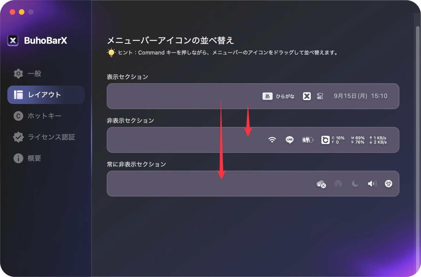 BuhoBarX 1.0はMacのメニューバーのアイコンを「常に表示」、「非表示」、「常に非表示」といったグループに振り分けられるアプリです。よく使うアプリにはすぐアクセスでき、あまり使わないアプリはスッキリ隠すことができます。