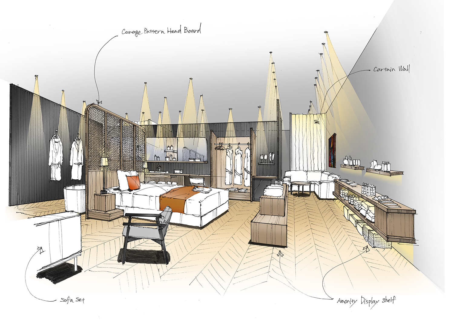 ホテルの客室を中央に設けたレイアウトで、煩雑さや雑多な感じを一切排除しシンプルな空間に仕立てております。これまでSEIARROWSのショールームは福岡のみでしたが、今回、東京で初の実店舗の出店となります。