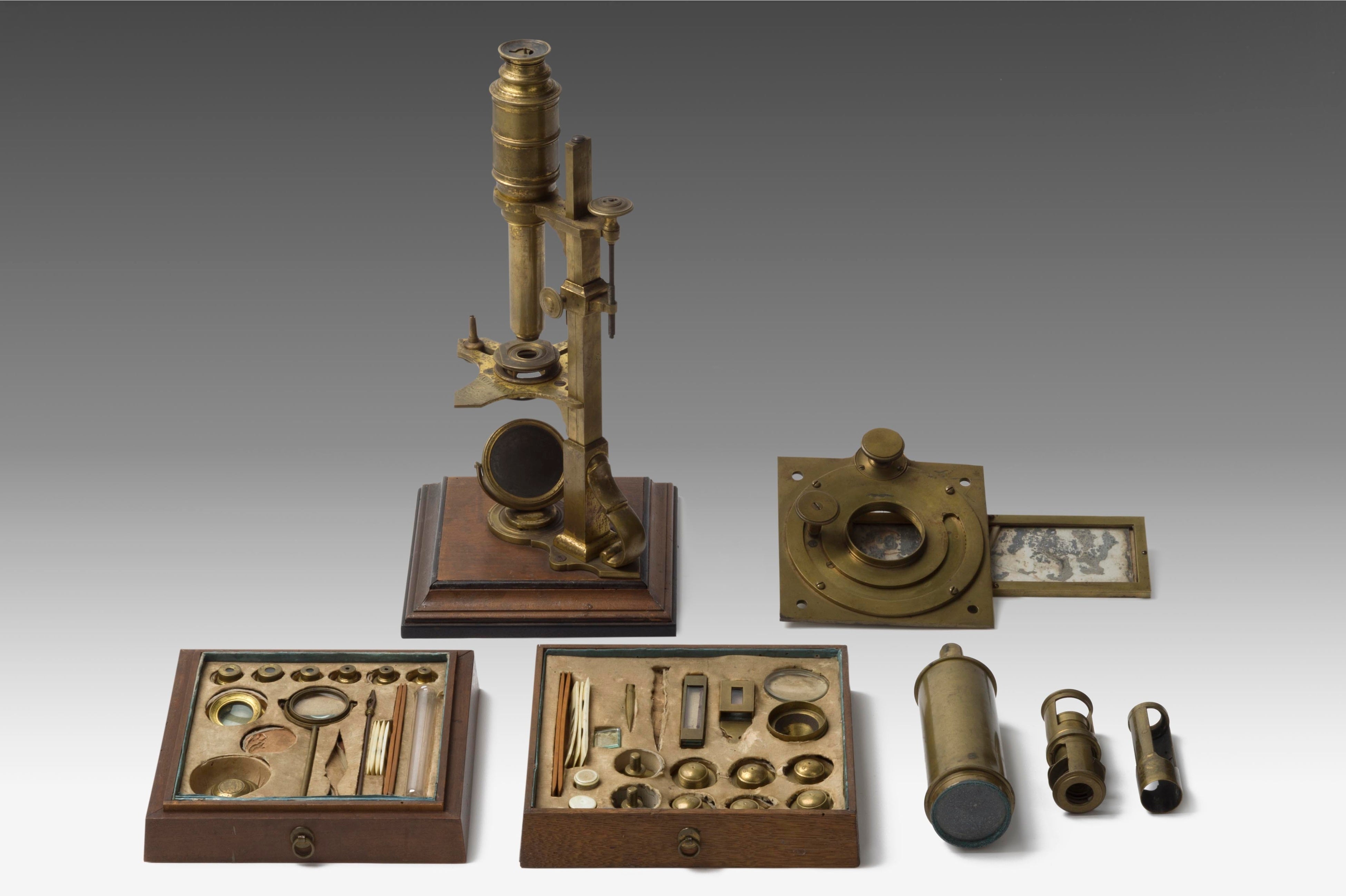 明治時代に順天堂で使用されていたと伝わる英国製カフ式顕微鏡一式。