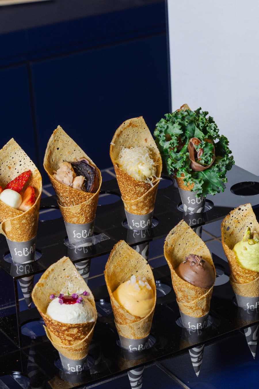 「クレープを手土産に」をコンセプトに、クレープは本来その場で食べる事が主流ですが持ち歩きやすいようなサイズ感にすることで1人でもいろんな味を楽しめる”選ぶ楽しさ”も追及しました。そば粉100%の生地の上には色とりどりの食材が並び、食べ進めるごとに違った食感や味わいが楽しめるよう層が重なっています。甘いものから塩気のあるものまで、様々な食べ方で楽しんでいただけます。
