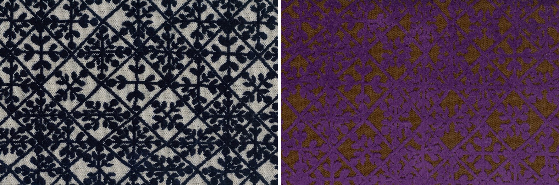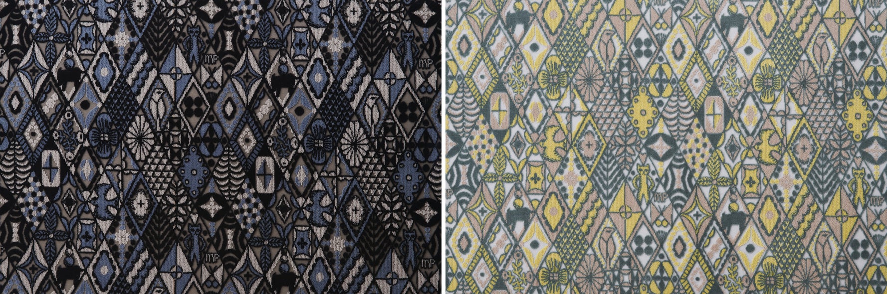 自然の中にある景色や表情を万華鏡で覗きこんだら、こんな景色が見えるのではないかと想像しながら描いた柄です。ベルベットジャカードで表現しています。