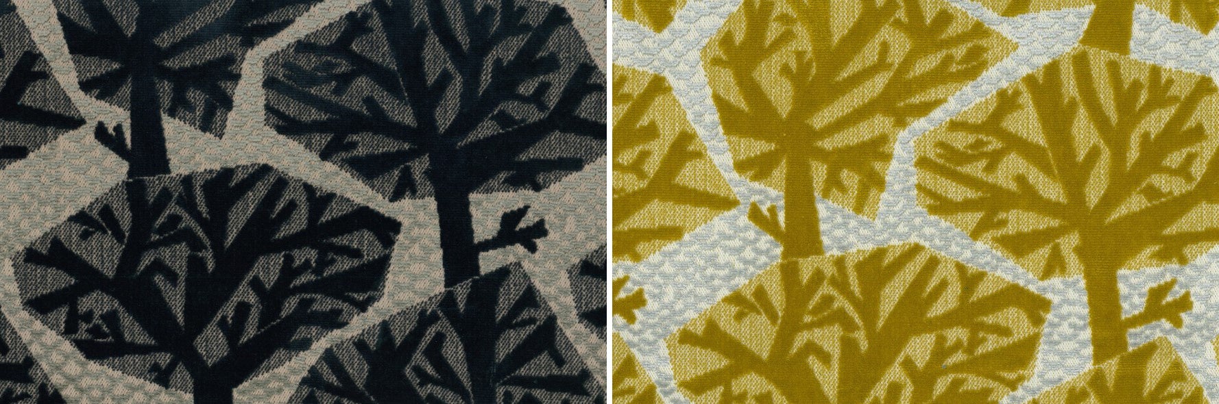 ところどころで鳥が羽を休めている様子や静まりかえった森の風景を、艶を帯びたベルベットジャカードで表現しています。