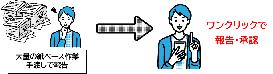 これまでの消防団の報告事務は、紙ベースで年間約41,000件の報告書を作成し、消防団内での承認作業、消防署への報告は、月ごとに直接持参するなど、消防団員にとって大きな負担となっていました。これを軽減するため、令和3年度に、報告事務をデジタル化する実証実験を行いました。