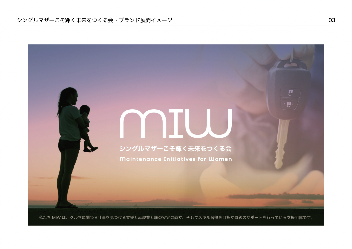 カスタマークラウド株式会社(本社:福岡県福岡市、代表取締役:木下寛士、英文:CUSTOMER CLOUD)は、クルマに関わる仕事を見つける支援と母親業と職の安定の両立、そしてスキル習得を目指す母親のサポートを行っている支援団体 シングルマザーこそ輝く未来をつくる会(運営本部:東京都新宿区、英文:Maintenance Initiatives for Women、略称:MIW)のCI(コーポレート・アイデンティティ)構築を担当した。