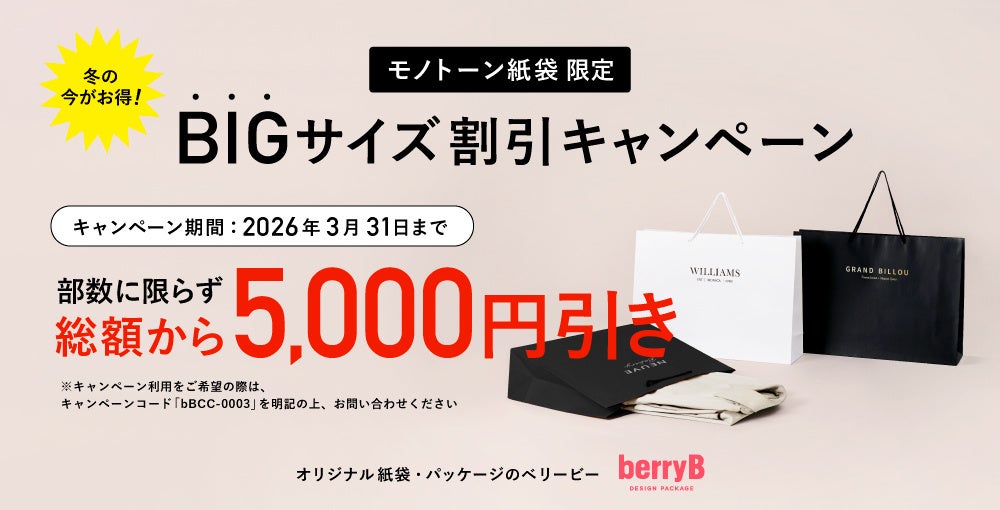 オリジナル紙袋・パッケージ製作を手がける「ベリービー」は、モノトーン紙袋の「BIGサイズ」限定で、総額から5,000円割引となるキャンペーンを2026年3月末まで開催しています。