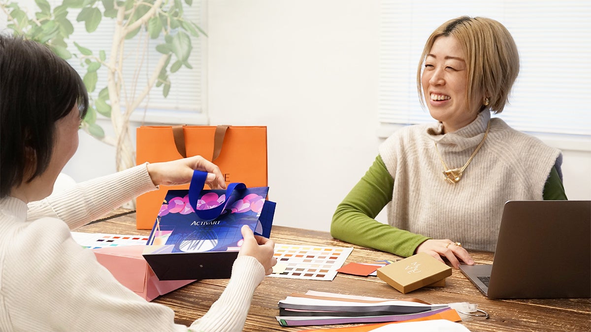 東京青山と大阪にあるショールームでは、紙袋専門のデザイナーがオリジナル紙袋づくりのサポートをいたします。オリジナル不織布バッグ、貼箱、紙管など多彩なパッケージの見本を直接手に触れながらご相談していただけます。
