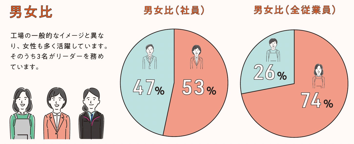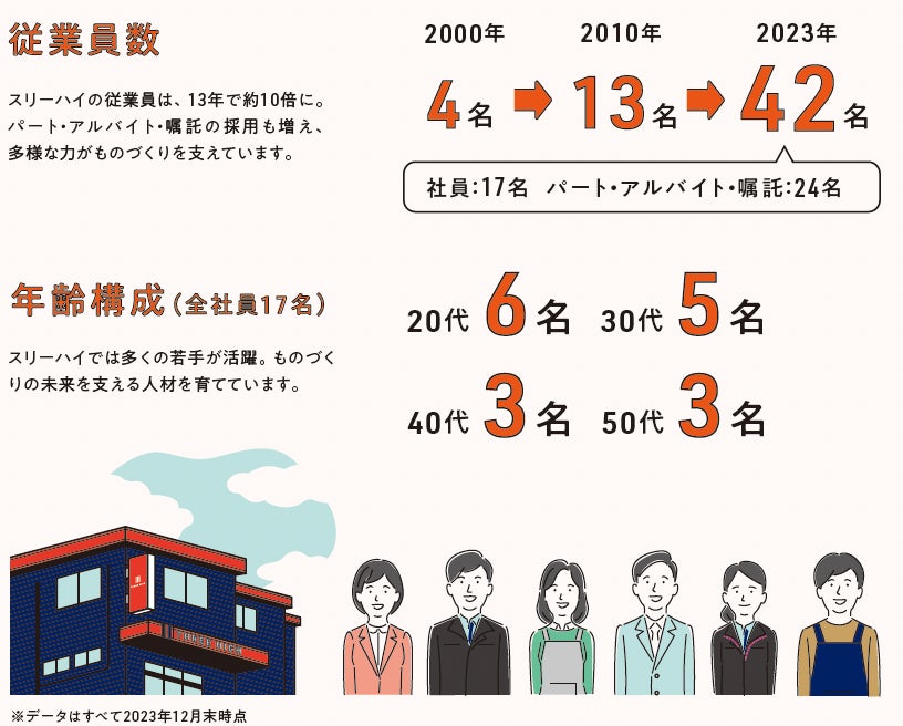 2024年1⽉現在、スリーハイのパート従業員も含めた男女比率は男性26%、女性74%と女性のほうが多いほか、当社の従業員は42名と、13年で約10倍になりました。