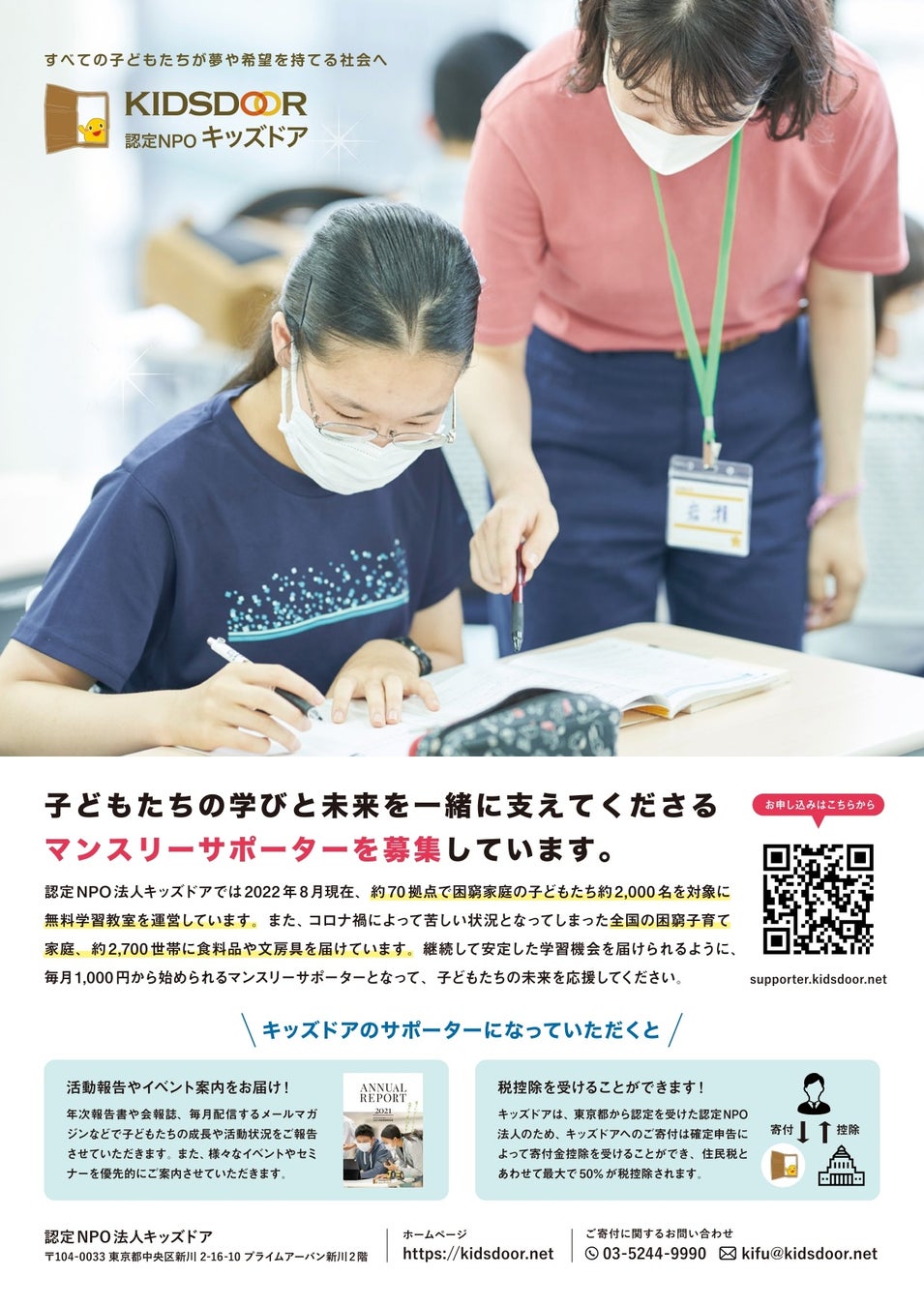 特にマンスリーサポーターは、キッズドアの事業の基幹である学習会運営等を支えて頂くものであり、また個人寄付者としてキッズドアとの関係を長きにわたって築いて頂く大切な寄付プログラムです。