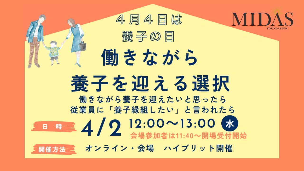 一般財団法人ミダス財団(所在地:東京都港区、代表:吉村英毅、以下「ミダス財団」)は、養子の日(4月4日)にむけて特別養子縁組制度を広く知って理解を深めていただくためのセミナーを4月2日(水)に開催いたします。