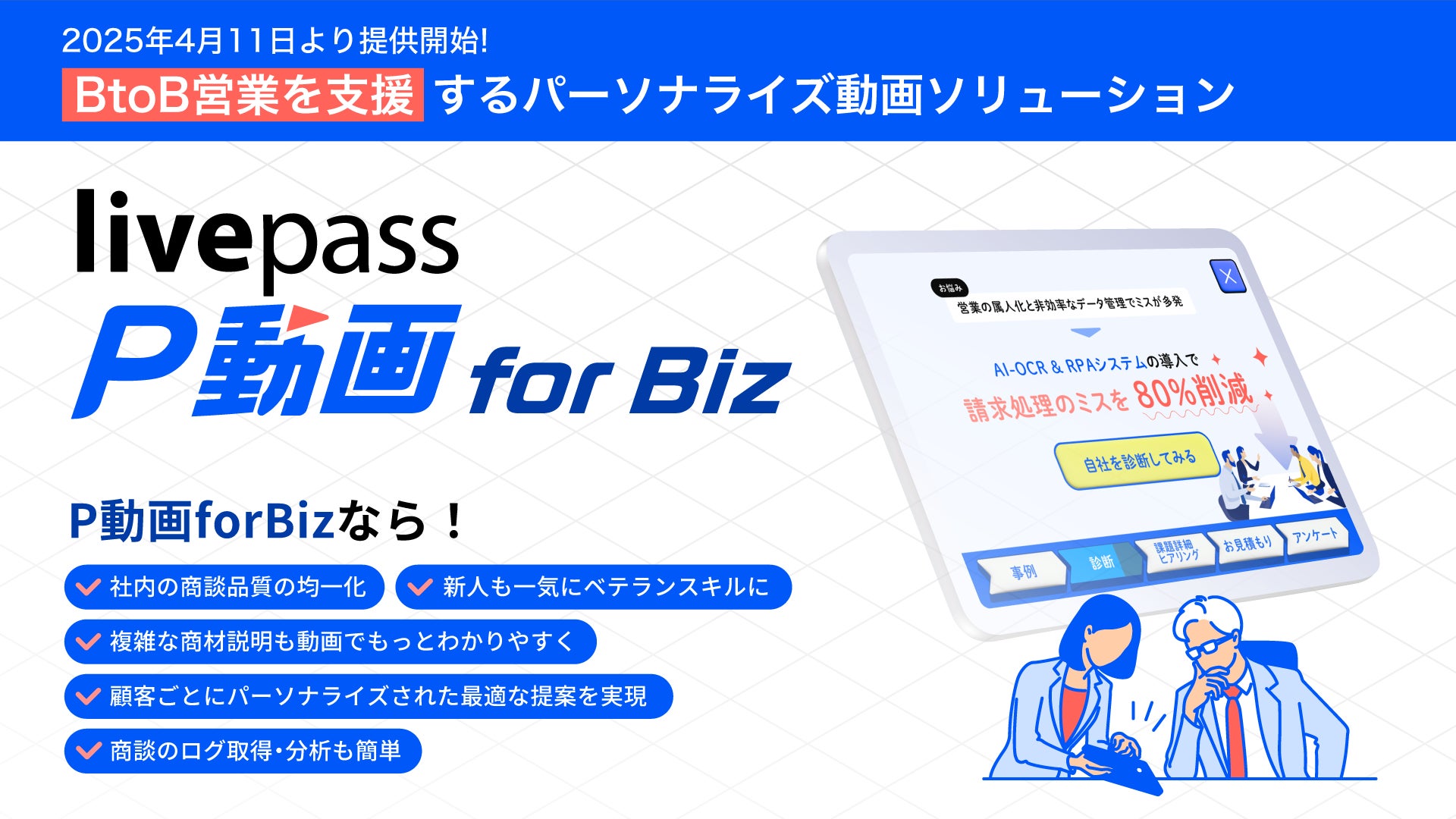 livepass株式会社(本社:東京都港区六本木、代表取締役CEO:中村旭宏、以下livepass)は、独自特許技術をベースとしたBtoB営業を支援するパーソナライズ動画ソリューション『P動画 for Biz』の提供を2025年4月11日より開始いたします。