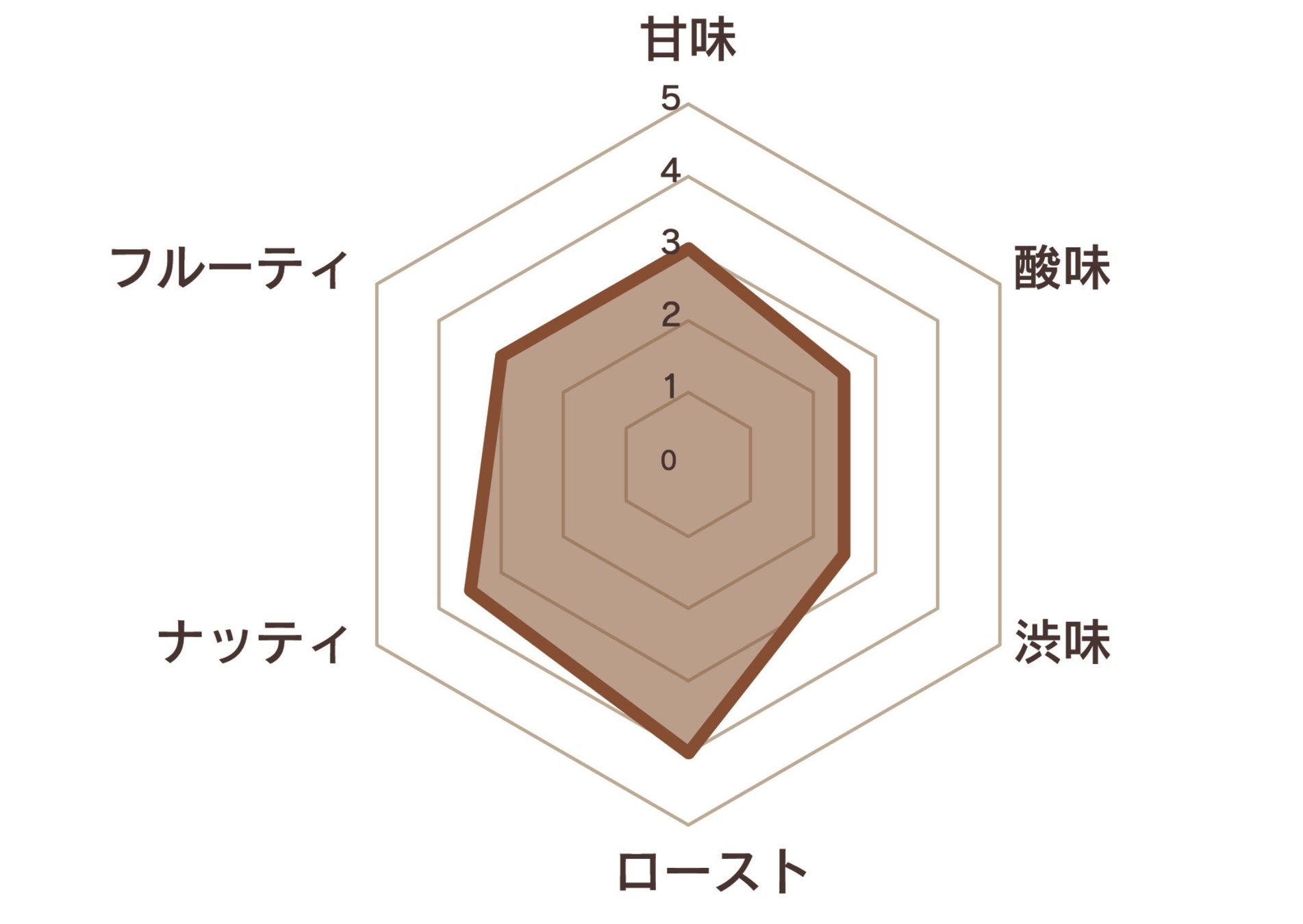 ・優しい甘さとドライフルーツのような穏やかな酸味の後に、ロースト感とナッティな風味が広がる