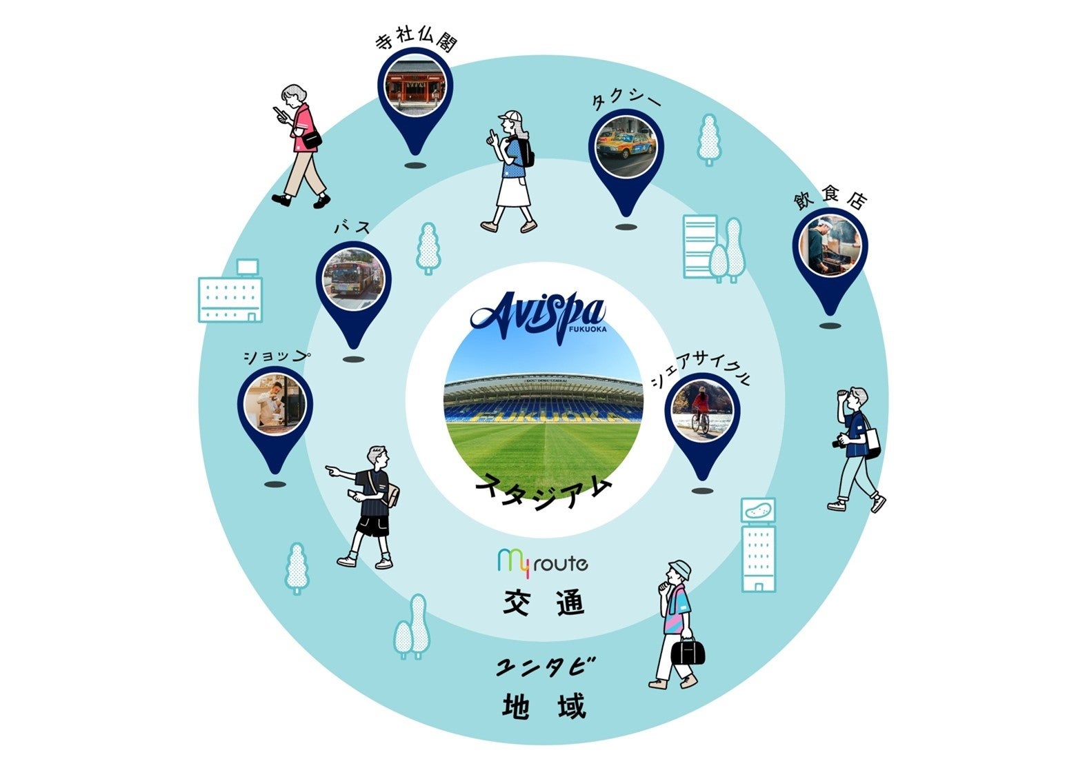 バスやシェアサイクルといった「交通」、飲食店や観光スポット等の「地域」、そして、ホーム・アウェイの「両サポーター」が連携し、『ユニタビ』にてサッカー観戦に結び付く様々な情報を観戦に訪れる皆様に提供し、より有意義なサッカー観戦のサポートと、福岡ならではの体験を存分にお楽しみいただきたいと考えています。またスタジアム周辺だけでなく、地域の周遊や消費を促進し、域外からの需要を取り込むことで、地域経済の活性化に寄与してまいります。