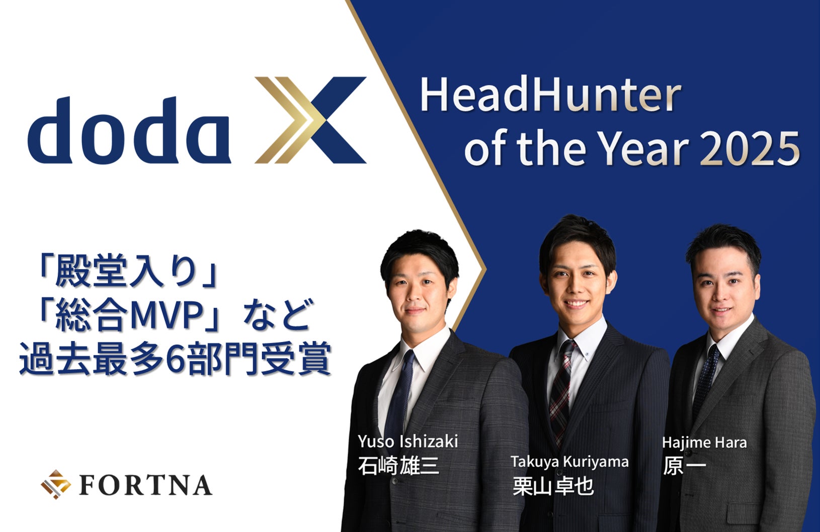 ハイクラス転職エージェントのフォルトナ株式会社(代表取締役:三石 真司、本社:東京都千代田区)は、パーソルキャリア株式会社が運営をするハイクラス転職サービス「doda X」主催「HeadHunter of the Year 2025」にて、史上初の殿堂入り・総合MVPを含む6部門で表彰されました。